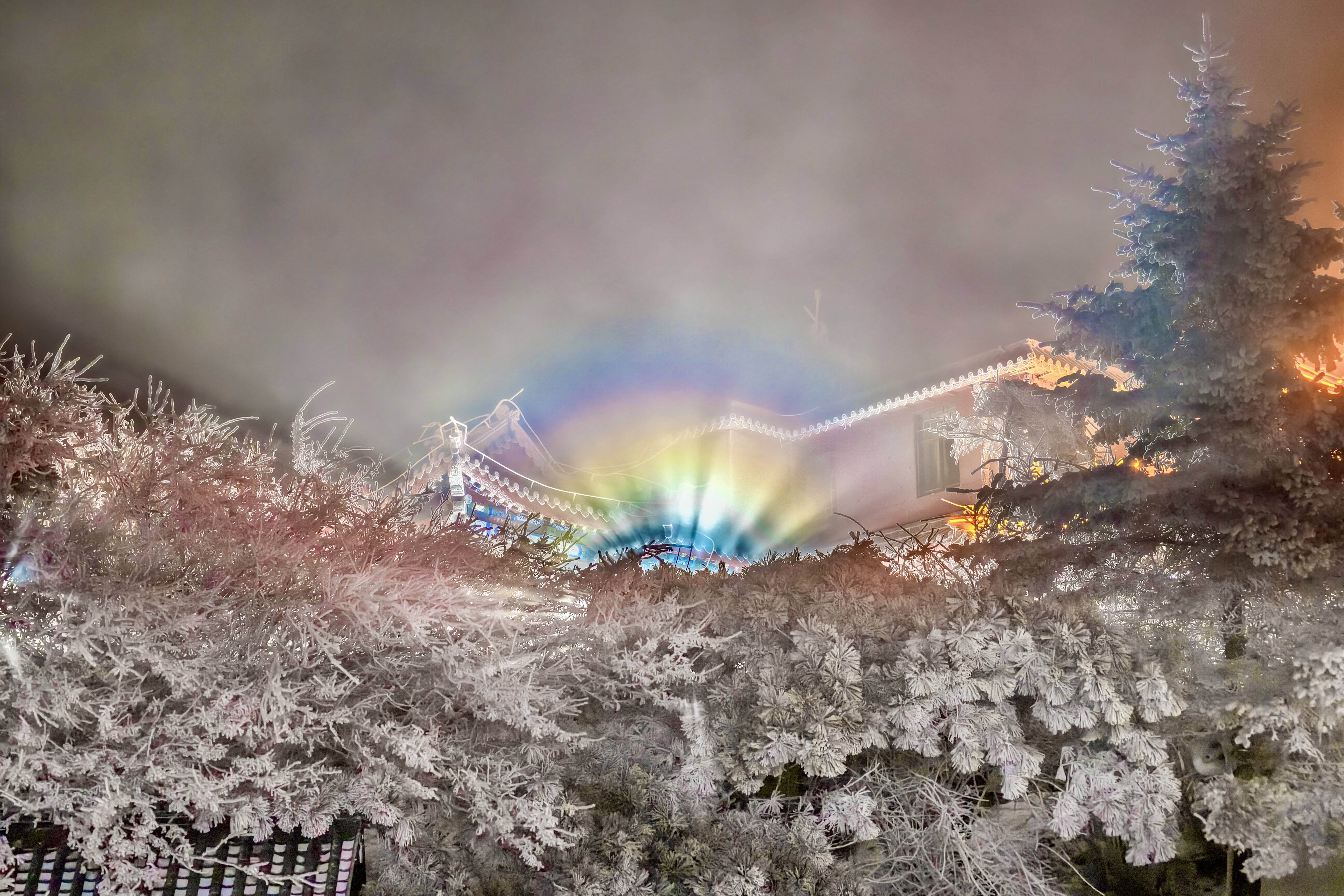 齐鲁网·闪电新闻1月22日讯 近日,泰山景区特约摄影师陈爱国在泰山极顶,用镜头记录下了一场转瞬即逝的罕见天象——夜空中,灯光映照云层,竟折射出一圈绚丽的七彩光环,宛如“七彩祥云”悄然绽放。