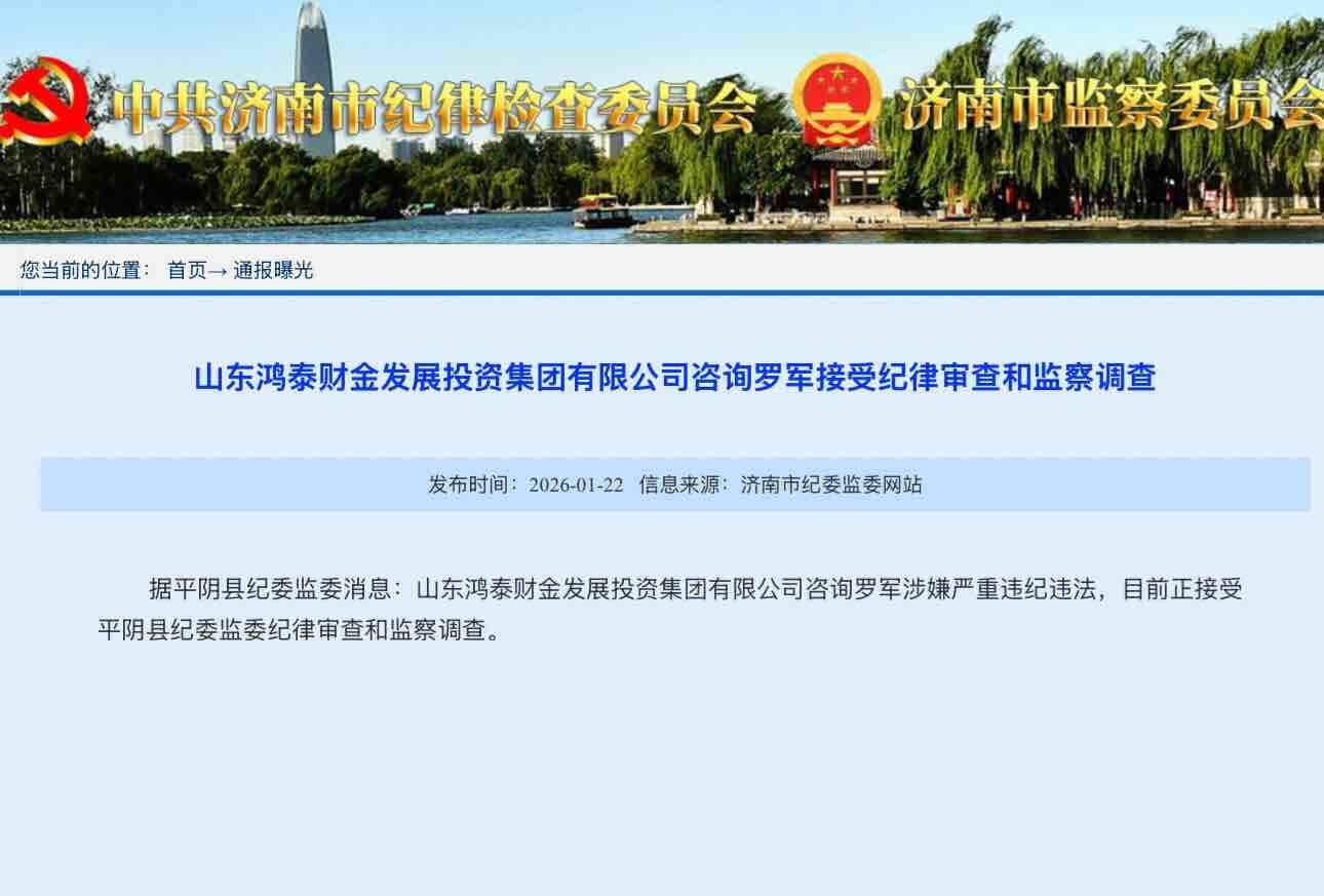 齐鲁网·闪电新闻1月22日讯 据平阴县纪委监委消息:山东鸿泰财金发展投资集团有限公司咨询罗军涉嫌严重违纪违法,目前正接受平阴县纪委监委纪律审查和监察调查。