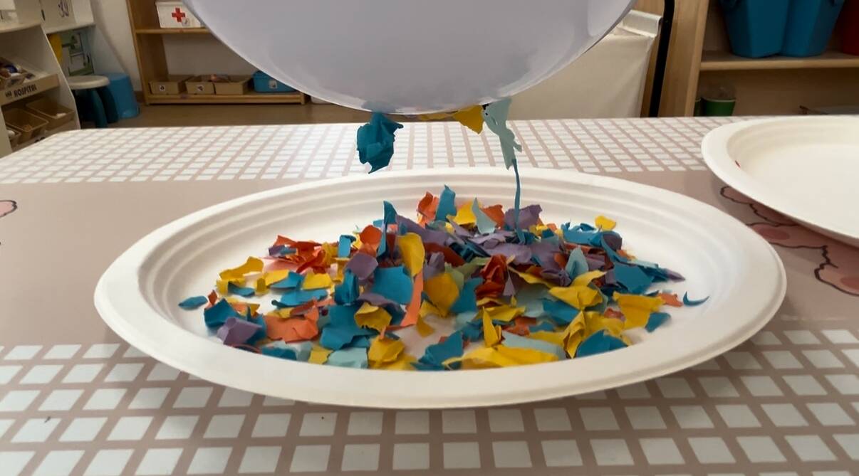 带着这份好奇,老师带领孩子们开启了静电探索之旅。宝贝们拿着彩色气球,在头发上、衣服上反复摩擦,神奇的事情发生了:摩擦后的气球竟然紧紧粘在了头顶,变成了可爱的“气球帽子”;把碎纸屑撒在桌上,用摩擦过的气球靠近,纸屑像被施了魔法一样,纷纷吸附在气球上。