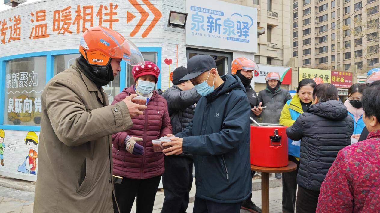 活动聚焦尊老敬老传统美德与对新兴职业群体的关怀,构建“固定点位+流动服务+上门配送”三维配送网络。主发放点设于世纪城社区九号楼老年人助餐点,方便老年人就近领取;“泉新泉驿”世纪城站点作为补充发放点,精准服务奔波的新就业群体;针对行动不便的特殊老年人,社区志愿者上门送粥,确保关怀无死角。