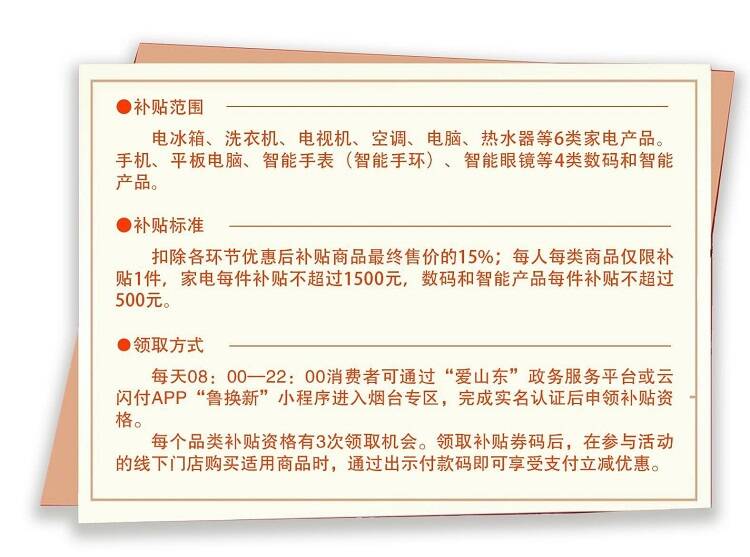 政策实施期间内,每天08:00—22:00消费者可通过“爱山东”政务服务平台或云闪付APP“鲁换新”小程序进入烟台专区,完成实名认证后申领补贴资格。消费者领取的补贴券码当天有效,有效期限以系统倒计时显示为准,过期失效或支付不成功可再次领取,每个品类补贴资格有3次领取机会,资格失效、支付不成功或发生退货将使用该品类的1次领取机会。领取补贴券码后,在参与活动的线下门店购买适用商品时,通过出示付款码即可享受支付立减优惠。补贴券码领取人、实际付款人、收货人须为同一人。