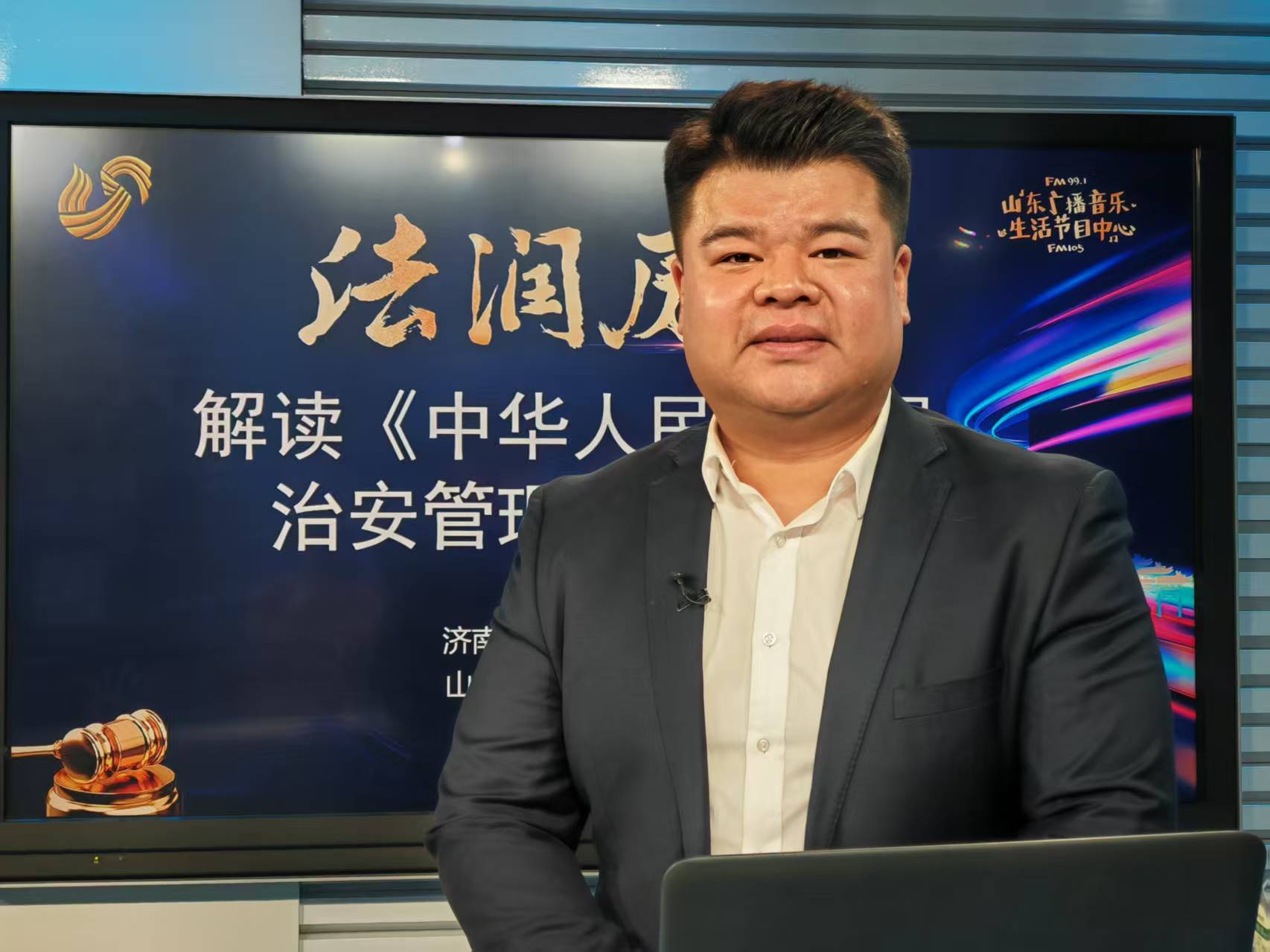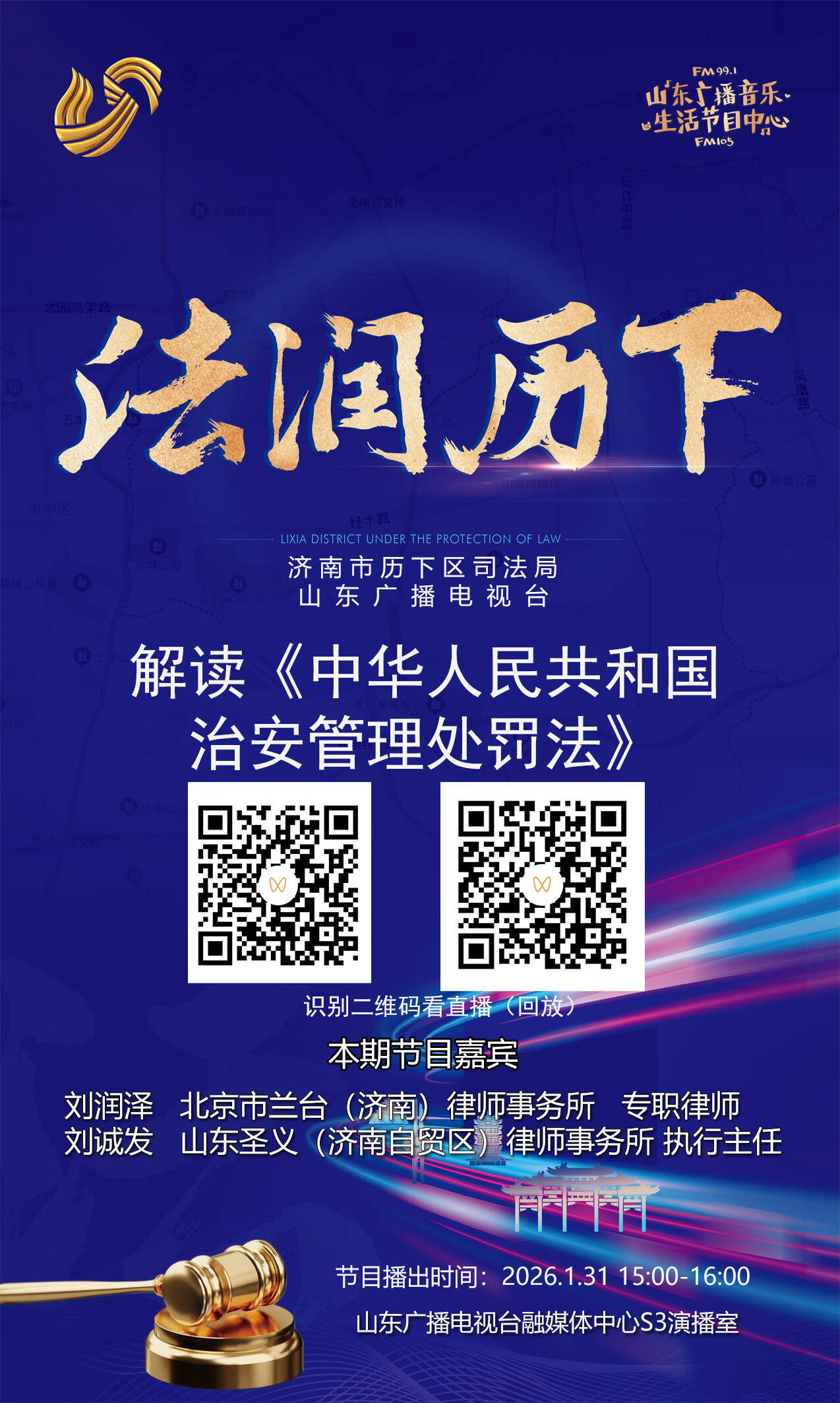 由济南市历下区司法局与山东广播电视台联合制作的《法润历下》节目邀请北京市兰台(济南)律师事务所专职律师刘润泽,与山东圣义(济南自贸区)律师事务所执行主任刘诚发律师一同聚焦《中华人民共和国治安管理处罚法》,围绕新修订的《中华人民共和国治安管理处罚法》展开深度解读,通过典型案例剖析法律亮点,为观众送上实用的法律科普 “大餐”。