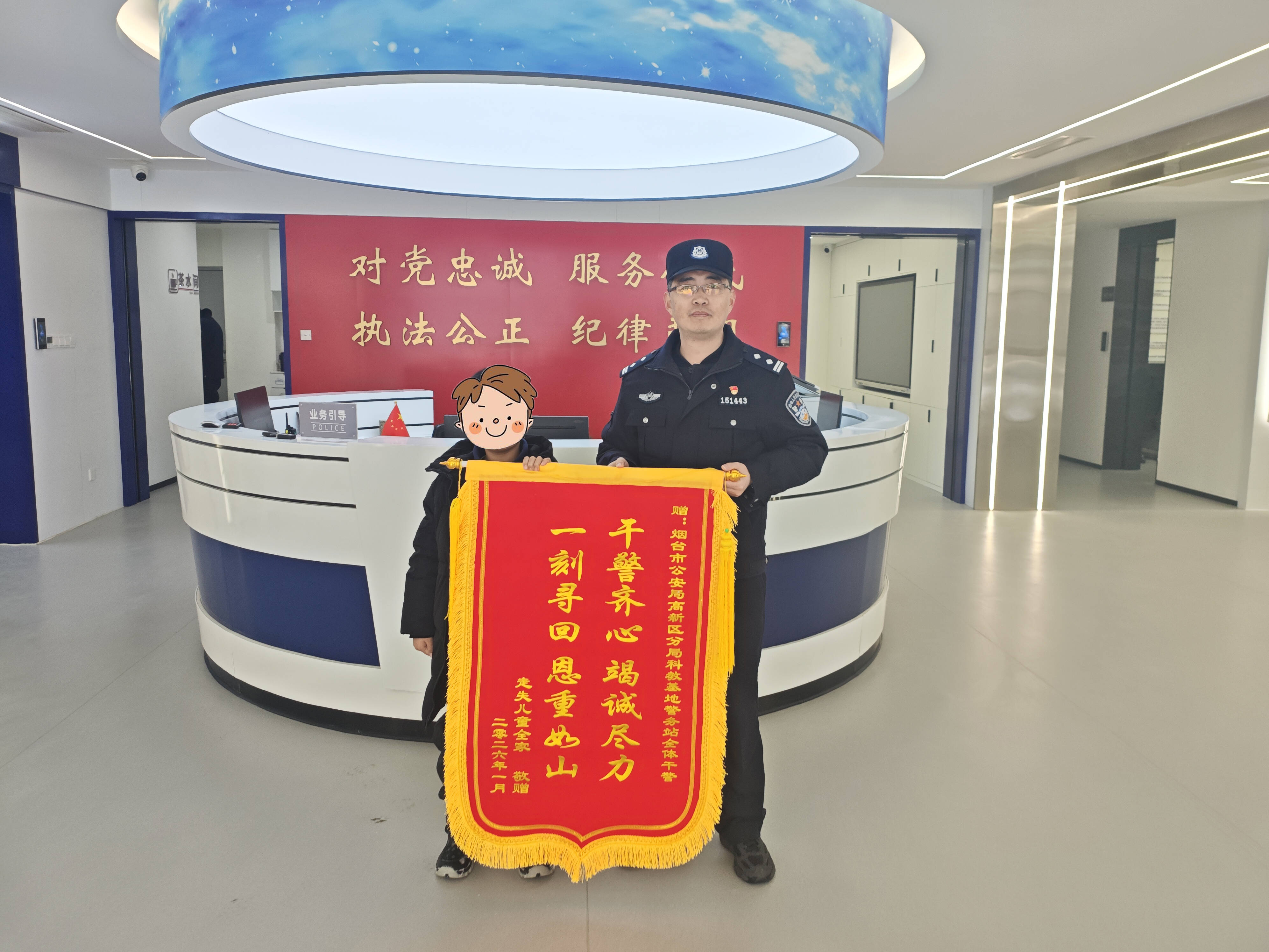 1月17日11时许,烟台市公安局高新分局科教基地警务站接110指令称:辖区一女子10岁的孩子在中海国际社区附近走失,急需帮助。民警迅速与该女子取得联系,并安排警力在指定区域查访、搜索,最终成功找到孩子并将其安全带回母亲身边。原来,当日孩子跟随母亲前往中海国际社区补牙,途中独自跑往别处玩耍,进而失去联系。1月26日,在母亲的带领下,小朋友将一面锦旗亲手送到了民警手中,并向警察叔叔承诺,今后不会随意乱跑,不再让妈妈担心了。
