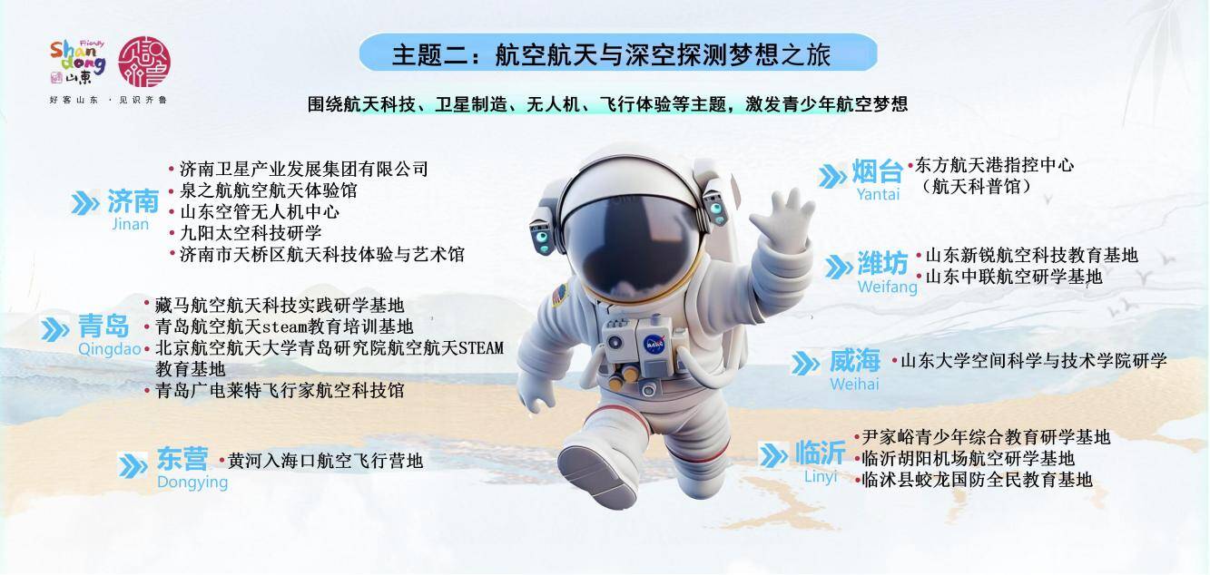 济南:济南卫星产业发展集团有限公司、泉之航航空航天体验馆、山东空管无人机中心、九阳太空科技研学、济南市天桥区航天科技体验与艺术馆