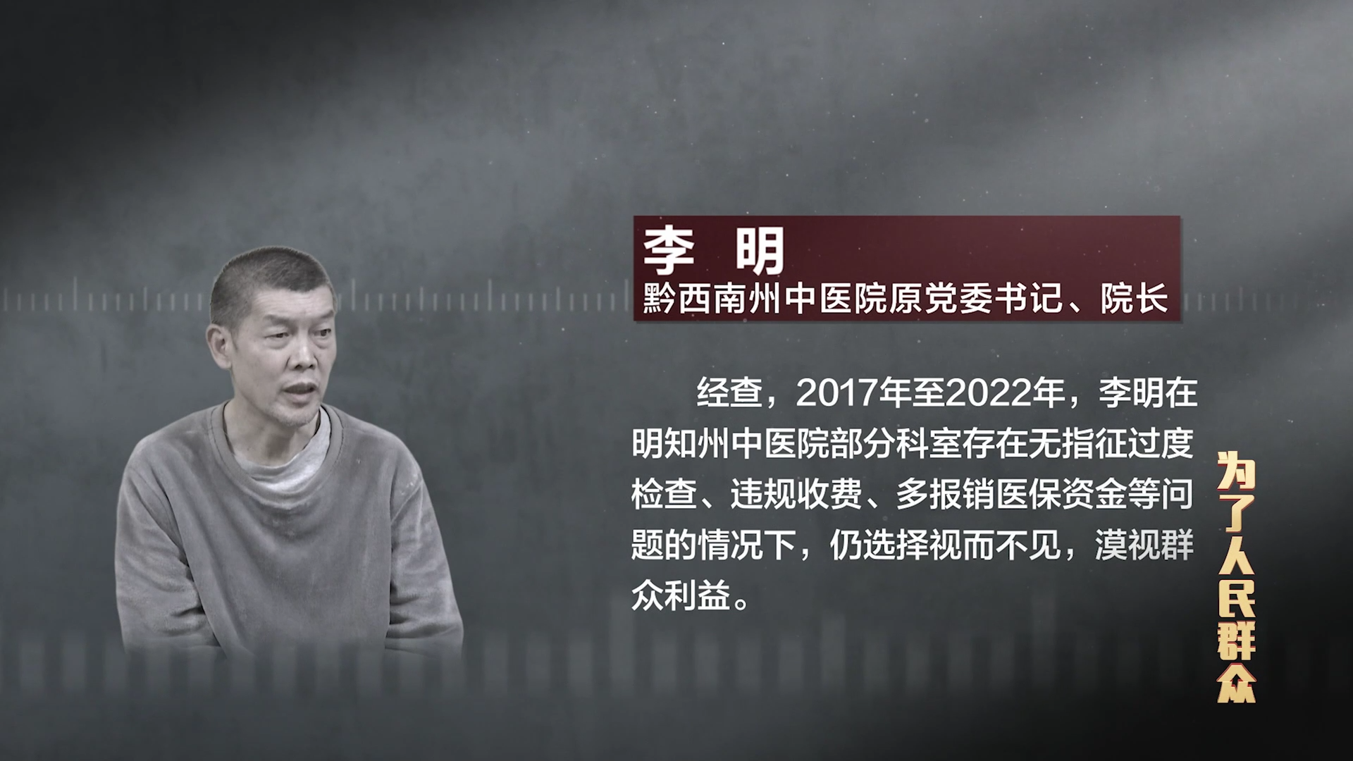 李明,黔西南州中医院原党委书记、院长。经查,2017年至2022年,李明在明知州中医院部分科室存在无指征过度检查、违规收费、多报销医保资金等问题的情况下,仍选择视而不见,漠视群众利益。