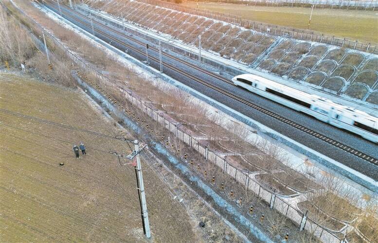 2月2日,国网淄博供电公司工作人员正在对高铁供电线路开展巡视检查。