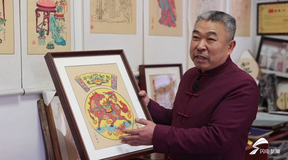 在西杨家埠村的和兴永画店内,画店第十三代传承人杨乃东正在印制名为“马上发财、事事如意”的年画。今年他创作的马年题材年画在色彩和图案上进行了创新,既完美展示了杨家埠木版年画色彩丰富的特点,又加上各种吉祥的图案,让年画更富美好寓意。这幅用杨家埠木版年画套色形式印刷的年画,寓意美好,造型美观,一经推出就受到市场的欢迎,已售出近万张。