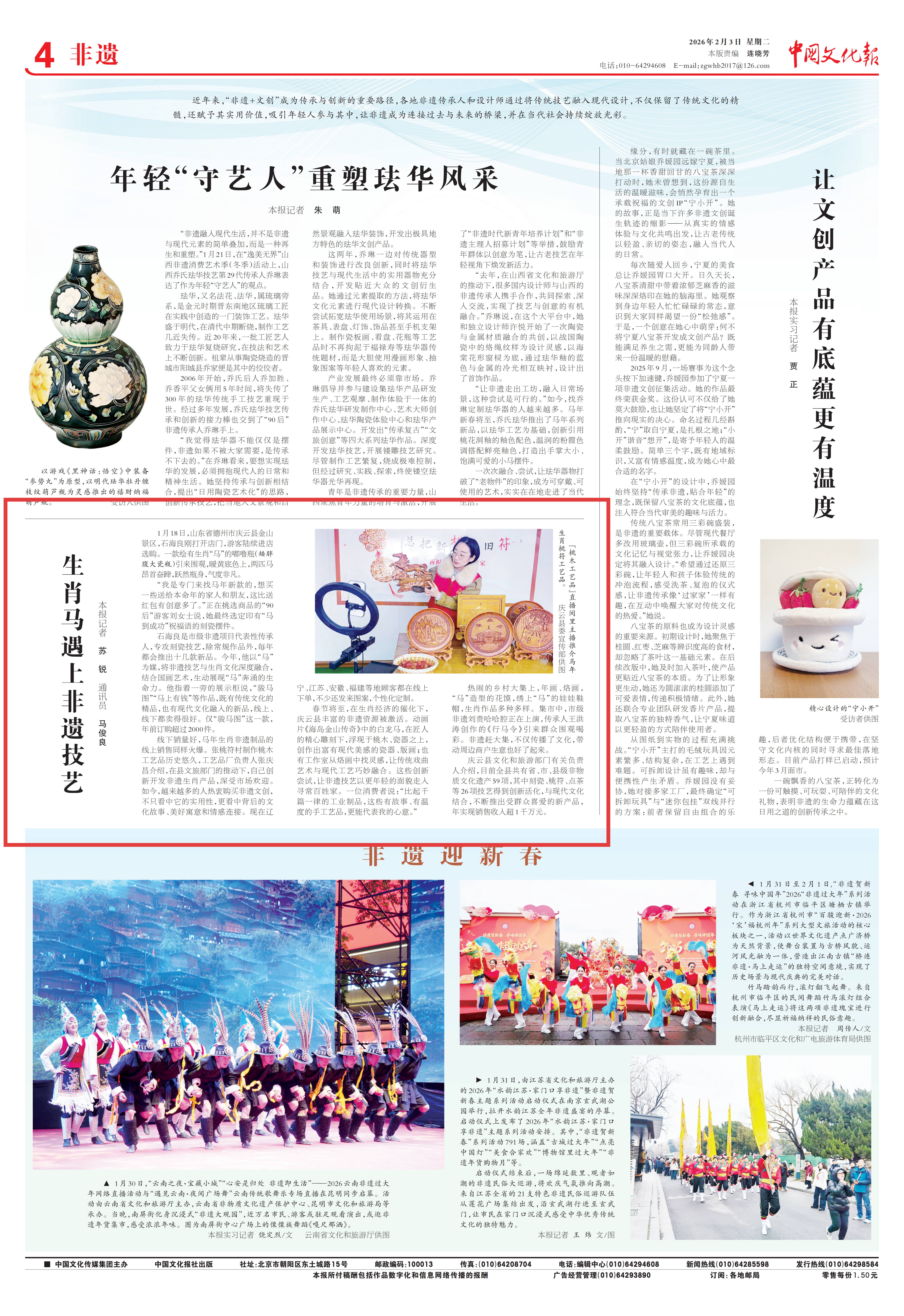 2月3日,《中国文化报》4版刊登《生肖马遇上非遗技艺》新闻稿件,报道庆云县以生肖文化为契机,推动非遗技艺通过创新实现活化发展的鲜活实践。报道指出,庆云县依托丰富的非遗资源,通过“非遗+生肖”“非遗+文创”等多重融合,各类生肖产品销售旺盛,不仅让传统技艺焕发新生,更有效带动了消费增长,形成了一道独具特色的县域文化风景线。