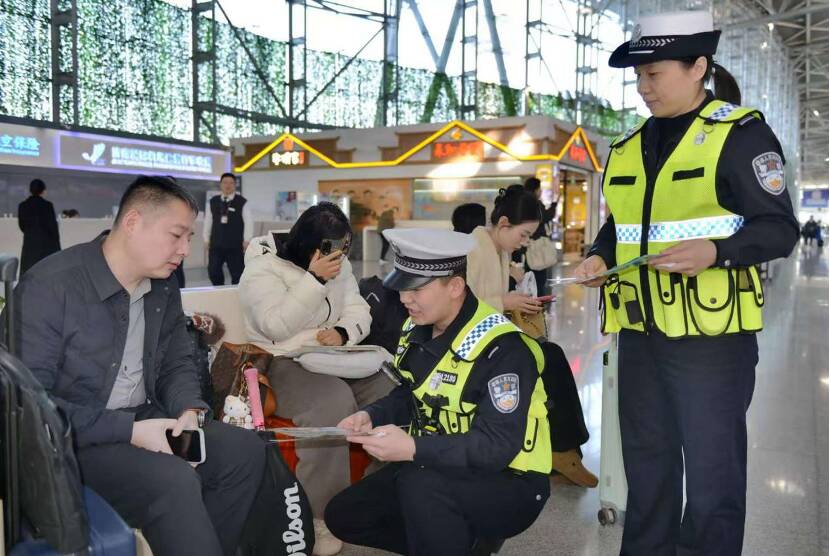 (机场公安局交巡警支队直属大队民警向候机旅客宣讲交通安全知识 王琦摄)
