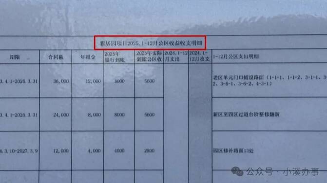 记者在小区一处堆放杂物的区域看到了雅居园小区关于公共收益的公示的2025年1月至12月一整年的公区收益收支明细。不过,对于目前账户总余额以及制表单位并没有体现。记者通过电话联系上了雅居园社区居委会相关工作人员。