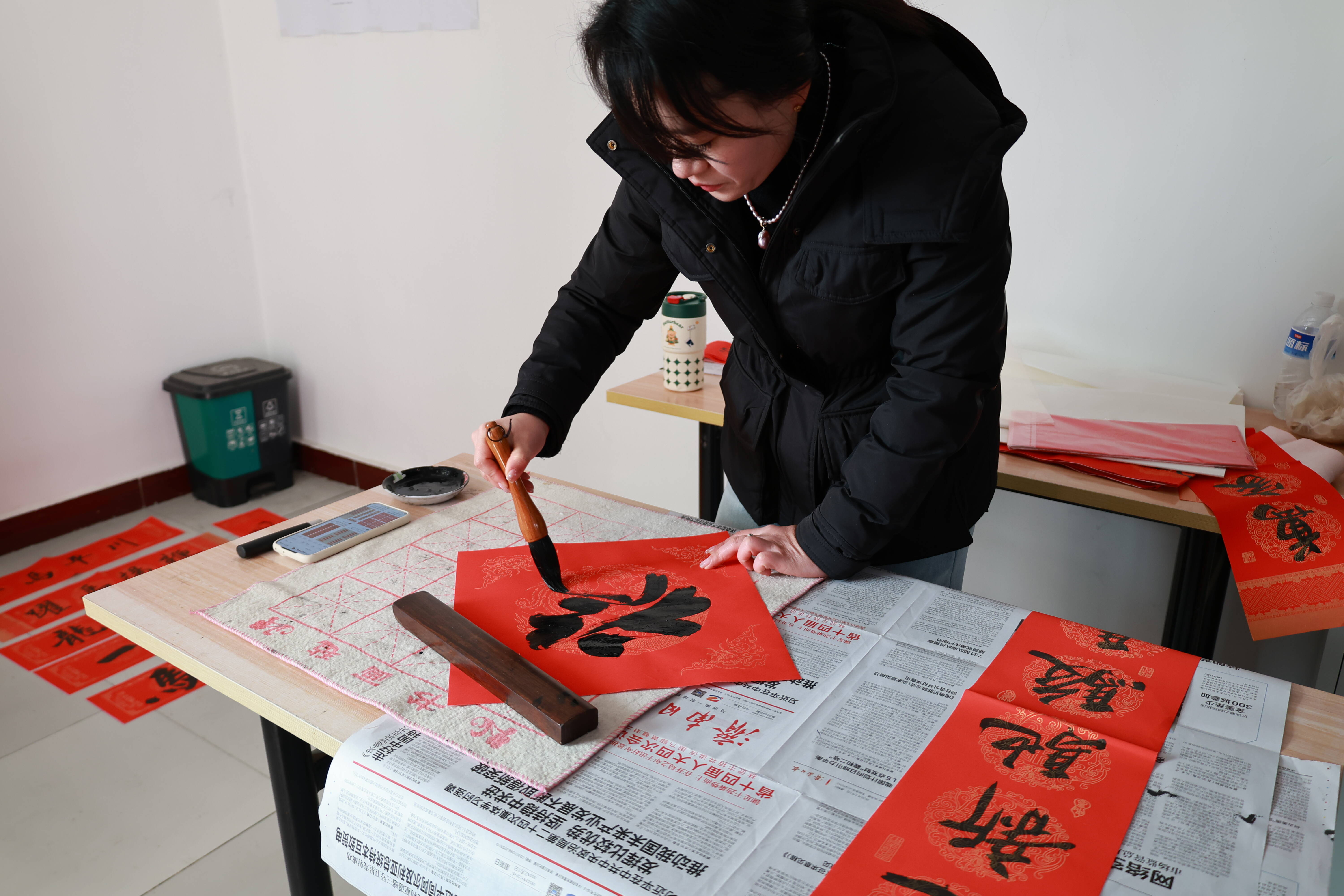 活动现场墨香四溢、年味浓厚。灰堆村村委会邀请本村及周边退休教师、新时代文明实践志愿者等书法爱好者现场挥毫泼墨。村民们闻讯而来,品着暖心大碗茶,欣赏书法创作,有序挑选心仪春联内容。书法爱好者有求必应,笔走龙蛇间,一幅幅承载辞旧迎新愿景、寄托平安吉祥与乡村振兴祈愿的春联和“福”字跃然纸上,驿站内欢声笑语不断,氛围热烈和谐。