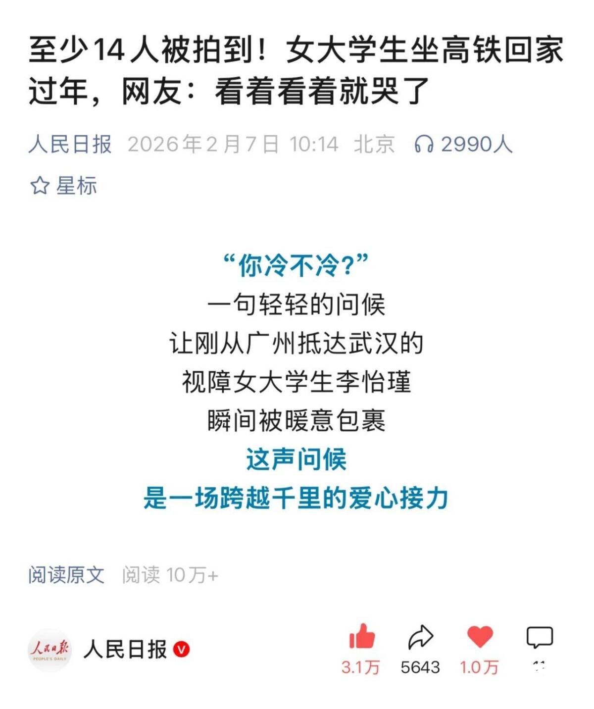 安检处,工作人员迅速移开踏台;高铁上,前排乘客默默调直椅背,邻座旅客主动安放行李;列车抵达武汉,站台工作人员轻声问候“冷不冷”,随后与地铁工作人员无缝衔接,一路护送她直至与父亲相遇。