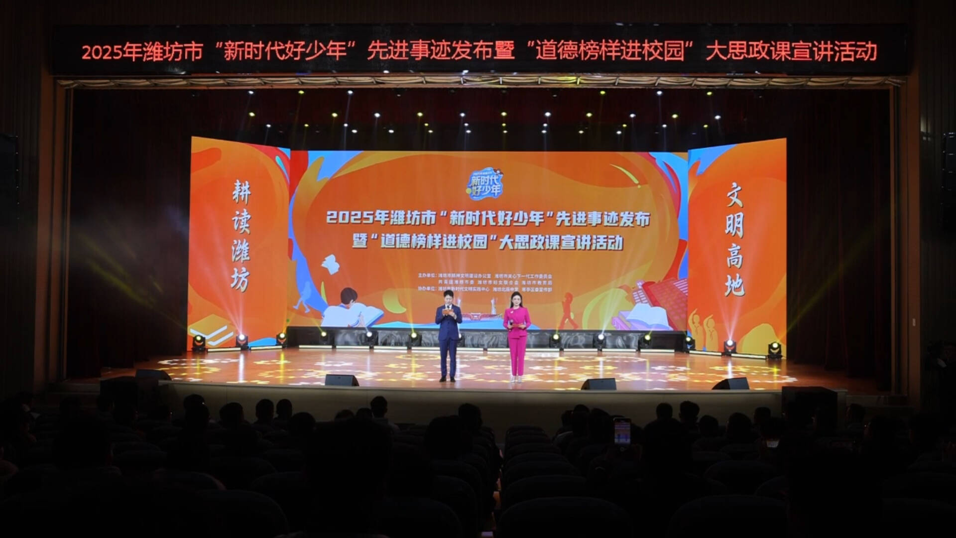 齐鲁网·闪电新闻2月10日讯 文明高地、耕读潍坊。2026年2月9日,由潍坊市委宣传部(市文明办)等单位联合主办的潍坊市“新时代好少年”先进事迹发布暨“道德榜样进校园”大思政课宣讲活动在潍坊北辰中学举行。活动通过表扬先进、对话榜样、文艺展演等形式,大力弘扬社会主义核心价值观,激励广大青少年见贤思齐、向上向善,生动展现了潍坊市青少年昂扬蓬勃的精神风貌和文化自信,为全市未成年人思想道德建设注入强劲动力。