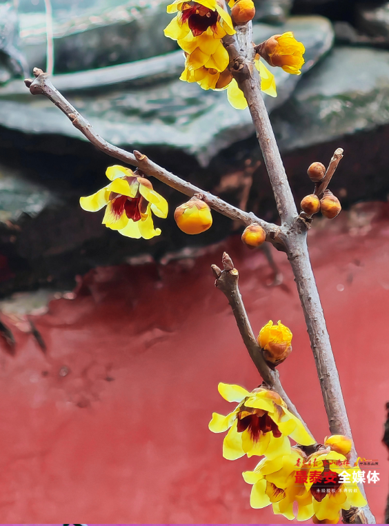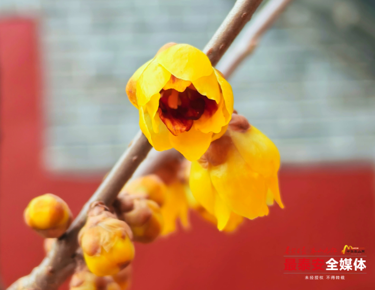 暖阳下,串串金黄色的玲珑花朵,与身后古朴亮丽的朱红殿墙、雕饰精美的中式窗棂相映成趣。暗香浮动间,流云飞卷的彩绘、黛色灰瓦与苍劲的梅枝共同勾勒出精致线条,将自然的生机完美镶嵌于历史的厚重框架之内。