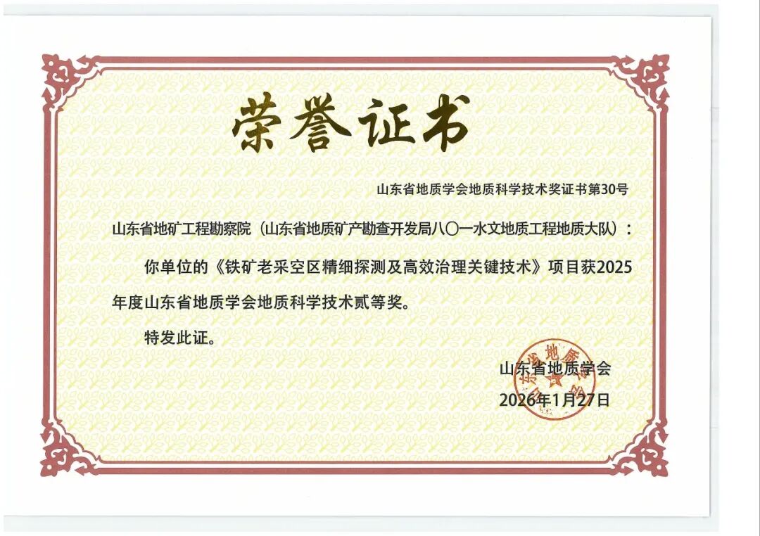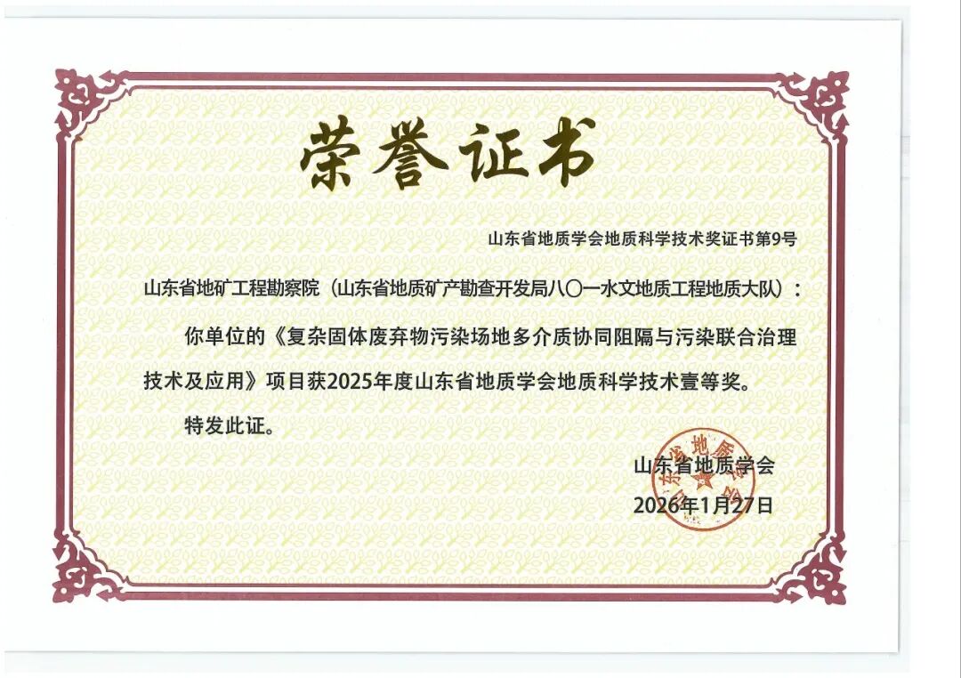 “复杂固体废弃物污染场地多介质协同阻隔与污染联合治理技术及应用”荣获地质科学技术奖一等奖,该成果针对复杂污染场地治理难题,创新性地提出了多介质协同阻隔技术,实现了污染治理的高效性与经济性统一。“铁矿老采空区精细探测及高效治理关键技术”荣获二等奖,该技术成功攻克了老采空区探测不清、治理低效的行业痛点,形成了系统的解决方案,为区域地面安全与资源再利用提供了可靠保障。
