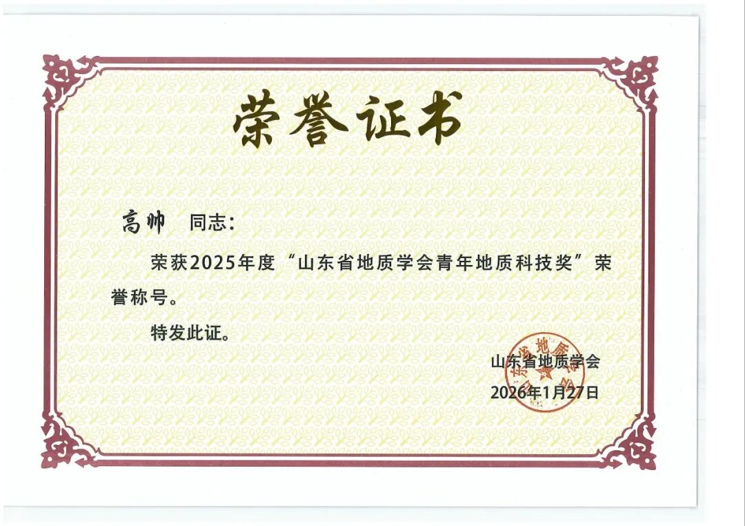 高帅荣获“青年地质科技奖”称号,这一荣誉既是对个人卓越科研能力与不懈探索精神的充分肯定,也生动反映了青年科技人才梯队建设的显著成效与蓬勃活力,彰显了省勘院在培养创新人才、激发科技潜能方面的坚实底蕴。