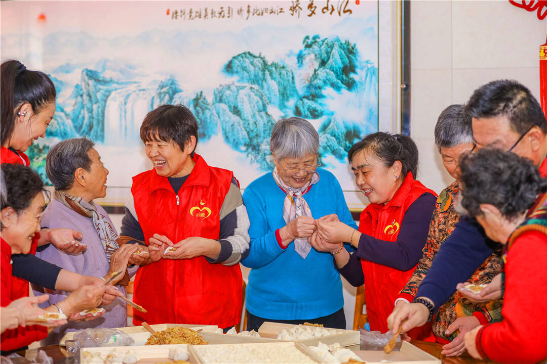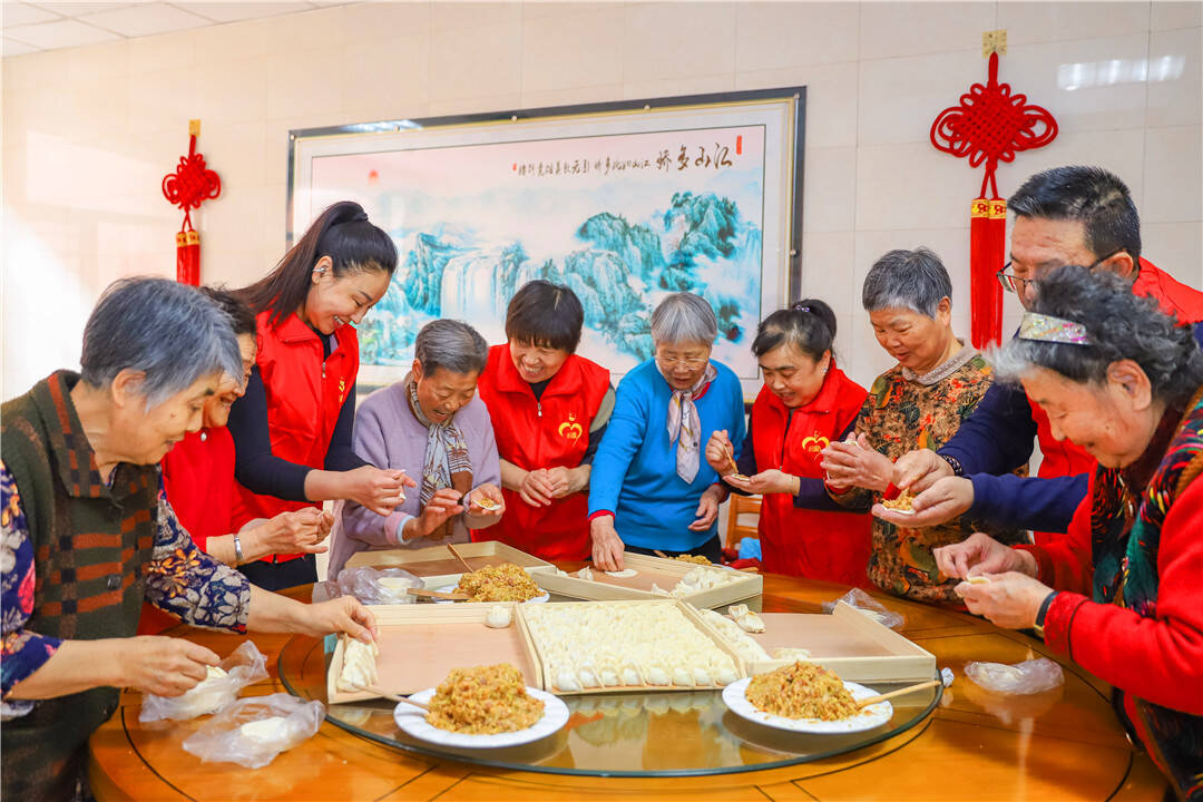 2月10日,在青岛市李沧区颐福养老院开展的“暖意迎新春 温情伴朝夕”主题活动中,党员志愿者和老年人一起包饺子。张鹰 摄