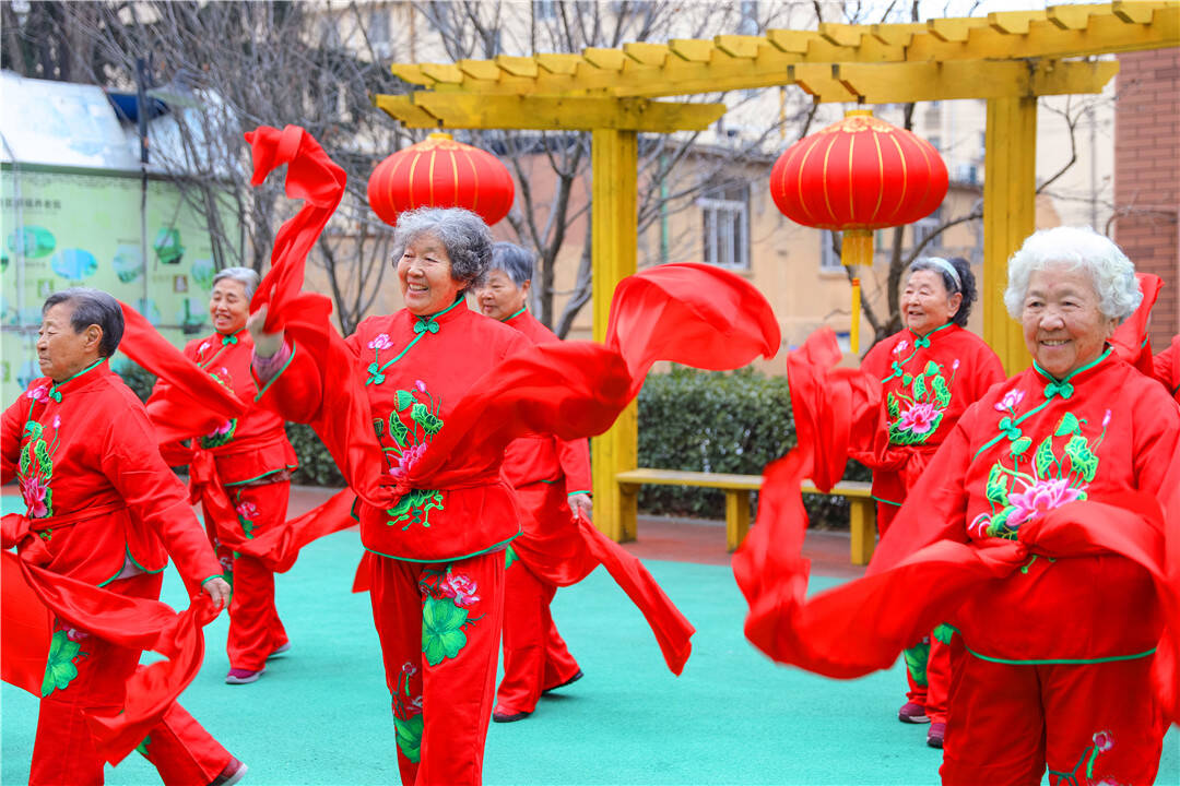 2月10日,在青岛市李沧区颐福养老院开展的“暖意迎新春 温情伴朝夕”主题活动中,老人们进行扭秧歌展演。张鹰 摄