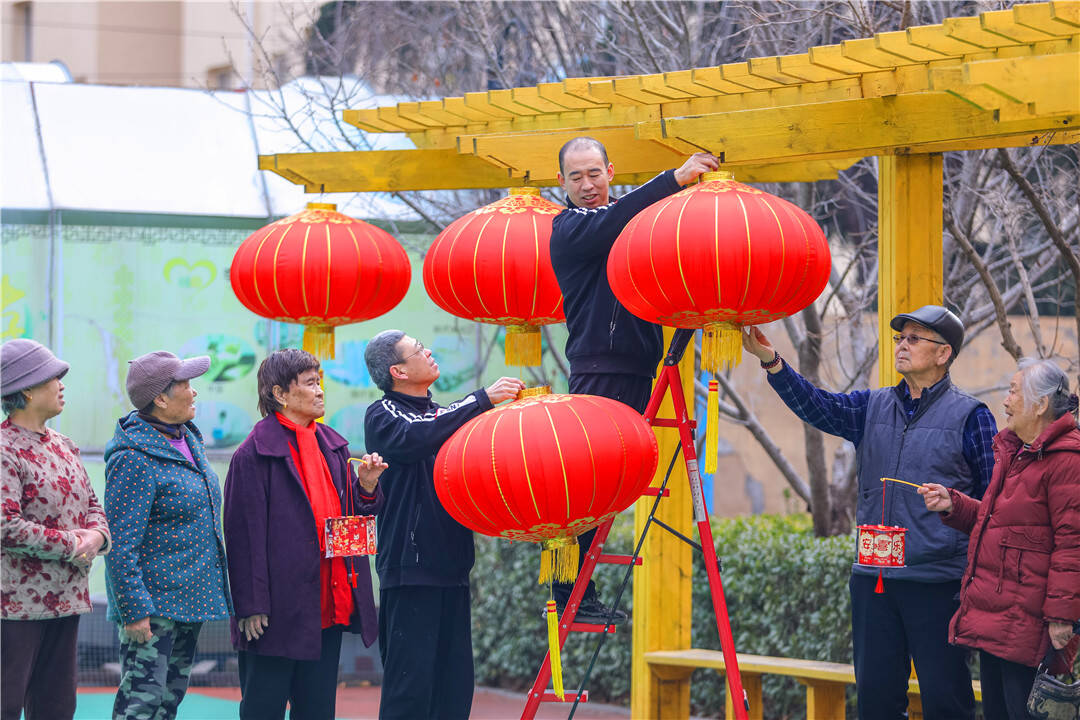 2月10日,在青岛市李沧区颐福养老院开展的“暖意迎新春 温情伴朝夕”主题活动中,工作人员和老年人一起挂灯笼。张鹰 摄