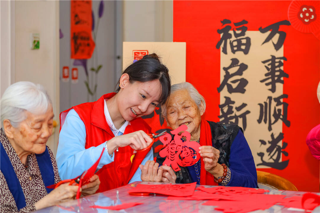 2月10日,在青岛市李沧区颐福养老院开展的“暖意迎新春 温情伴朝夕”主题活动中,志愿者和老年人一起剪窗花。张鹰 摄