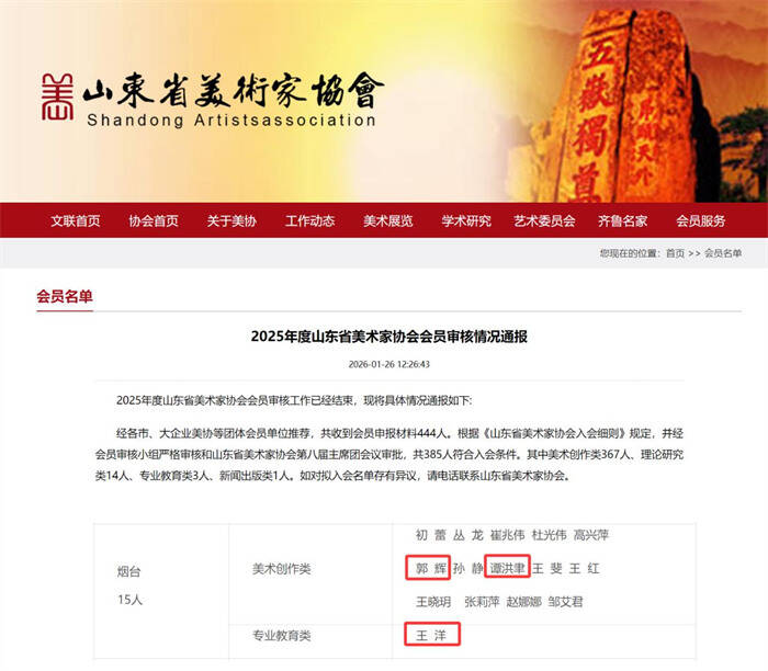 齐鲁网·闪电新闻2月11日讯 近日,山东省美术家协会正式公布了2025年度会员审核结果。经各市、大企业美协等团体会员单位审核推荐,根据《山东省美术家协会入会细则》规定,并经会员审核小组严格审核和山东省美术家协会第八届主席团会议审批,全省共有385人符合入会条件。其中美术创作类367人、理论研究类14人、专业教育类3人、新闻出版类1人。烟台南山学院艺术与设计学院王洋、郭辉、谭洪聿三位教师凭借卓越的专业造诣与丰硕的学术成果成功入选,标志着学院在高水平师资队伍建设及艺术学科建设方面再添新硕果。