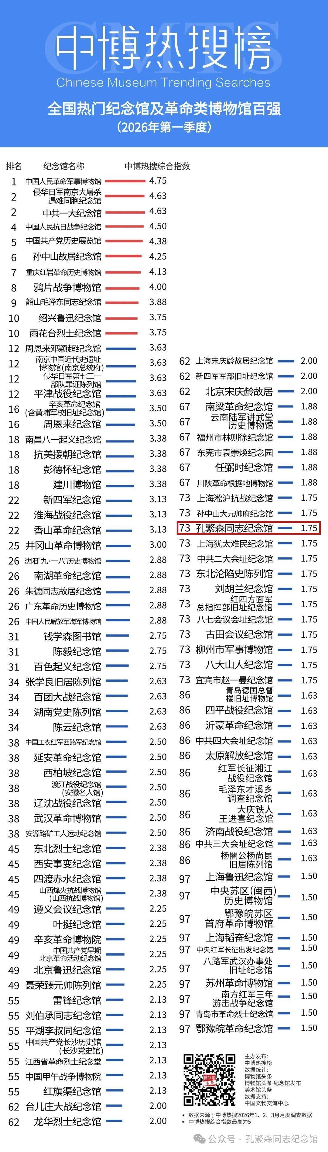 齐鲁网·闪电新闻4月13日讯 (山东经济广播记者张晶晶)由中博热搜榜主办发布,博物馆头条编辑部统计,中国文物交流中心数据支持的“中博热搜榜”今日发布2026年第一季度全国热门百强纪念馆及革命类博物馆榜单。孔繁森同志纪念馆上榜,位列第73名。