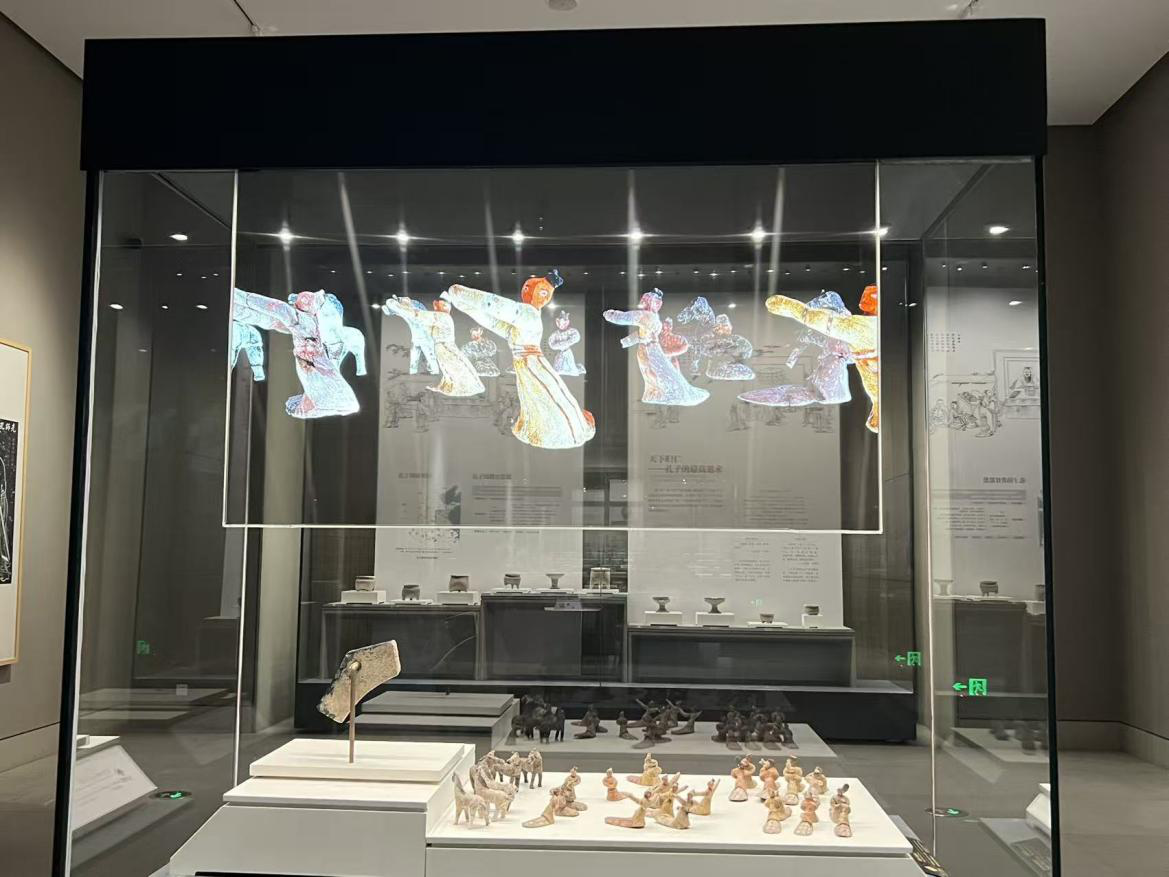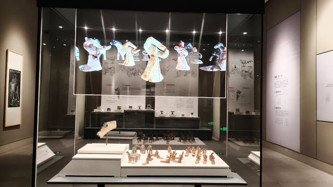 移步“泱泱齐风”第二展厅,春秋陶乐舞俑组团完成数字化实景焕新。展区创新融合明屏+裸眼3D动态全息动画双重黑科技,一键唤醒沉睡千年的古陶俑群,让静态文物秒变动态实景画面,古齐乐舞、宴饮的鲜活场景,陶俑原生态彩绘肌理、古法服饰纹样、灵动肢体神态全部以高清1:1比例还原,让观众一秒穿越至春秋战国齐都宫廷乐舞演出,身临其境品鉴先秦齐地独有的人文风貌与古典生活美学。