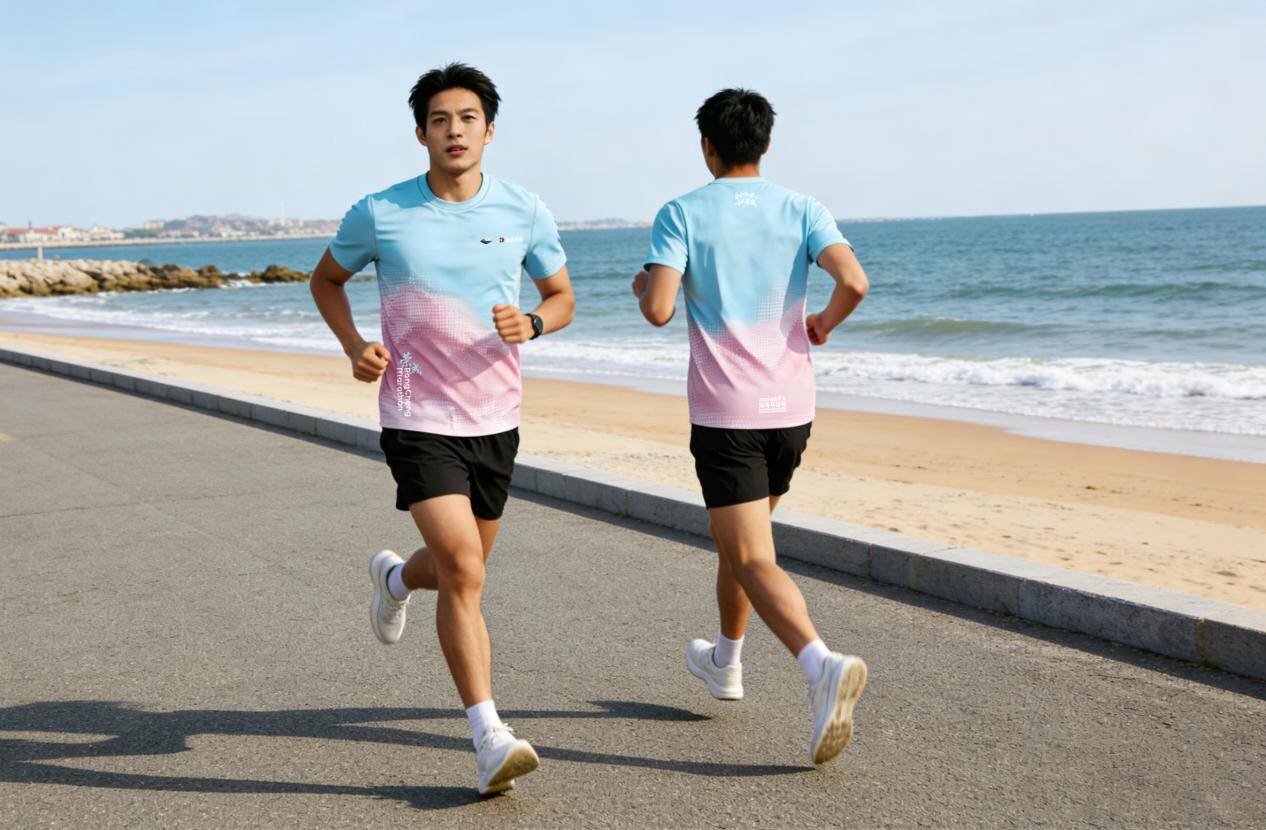 其中,半程马拉松参赛服采用从浅蓝到粉白渐变的撞色设计,上半部分的清透浅蓝,还原荣成滨海赛道的碧海蓝天;下半部分的柔粉渐变,呼应赛事举办时节樱花大道的春日盛景,蓝粉交织完美复刻“踏浪奔跑、樱风拂面”的赛道体验,视觉上清新灵动,凸显半马的活力与轻盈感。