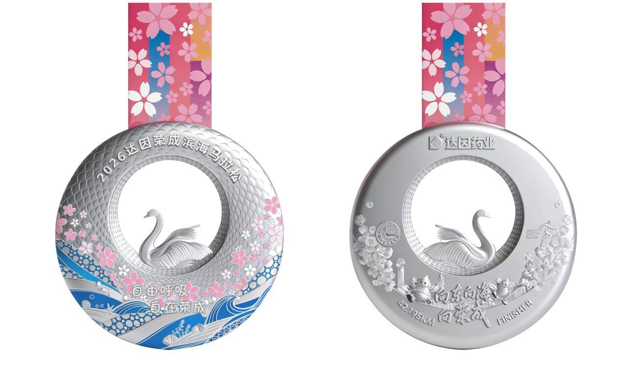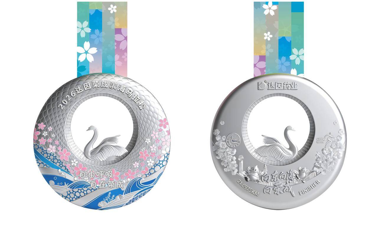 本届马拉松完赛奖牌的设计,将荣成城市底蕴、赛道特色与马拉松精神深度融合,分为马拉松完赛牌和半程马拉松完赛牌。奖牌中心设计以镂空浮雕工艺呈现大天鹅造型。大天鹅作为荣成的城市名片,不仅是生态荣成的象征,更寓意跑者在赛道上自由舒展、突破自我的状态,镂空设计让奖牌更具通透感与立体感,尽显灵动之美。下半部分融入蓝绿渐变的海浪纹样,还原荣成“最美滨海赛道”的踏浪体验。边缘点缀春日樱花,呼应赛事举办时节荣成樱花大道的盛景,将赛道沿途的山海浪漫与春日生机,永久定格在完赛奖牌上。织带以樱花为主题,渐变撞色设计与奖牌主体相呼应,佩戴时更显协调美观。