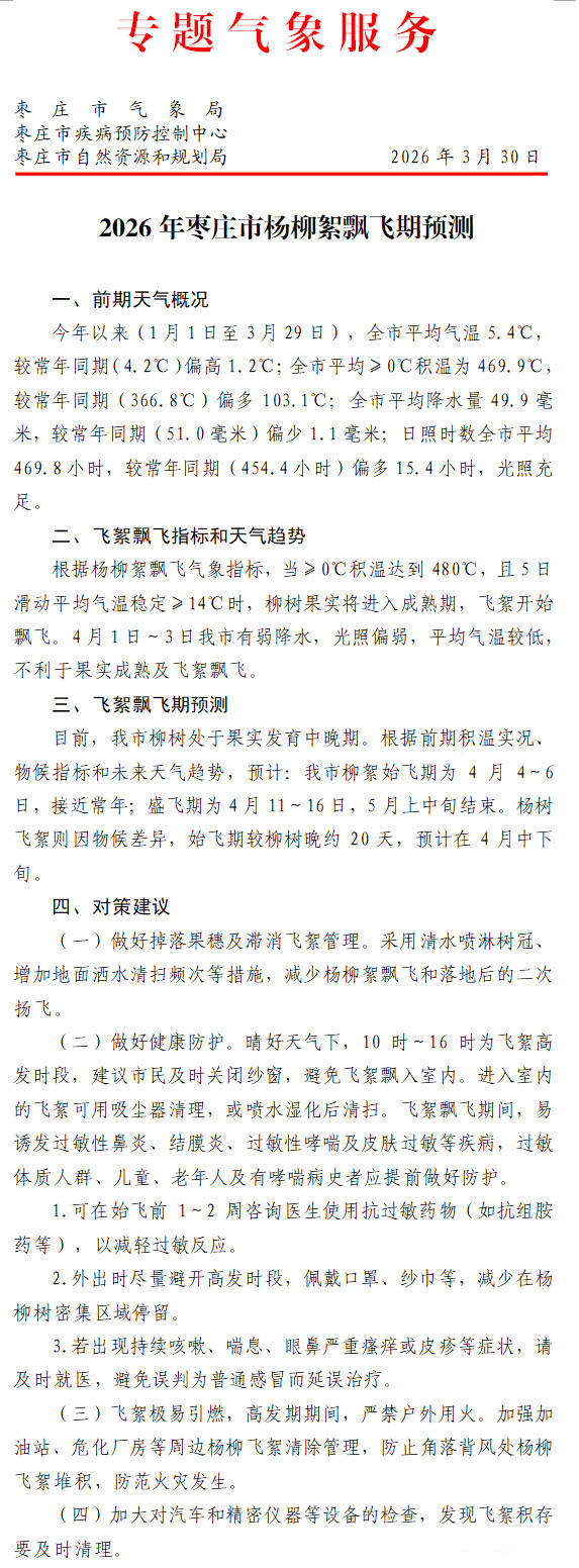 3月30日,枣庄市气象局联合枣庄市疾病预防控制中心、枣庄市自然资源和规划局共同发布《2026年枣庄市杨柳絮飘飞期预测》专题气象服务,为市民提前做好防护、相关部门科学治理提供精准指引。