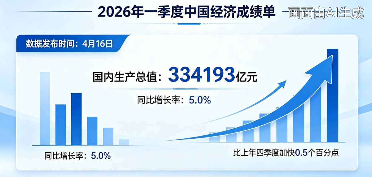4月16日,国家统计局发布的数据显示,2026年一季度国内生产总值334193亿元,按不变价格计算同比增长5.0%,比上年四季度加快0.5个百分点。经济增速达到全年预期目标区间的高线,在全球主要经济体中位居前列。在复杂多变的外部环境中,中国经济何以行稳致远、步履从容?一季度的这份“成绩单”正是最有力的回答,增长的成色更足、转型的步伐更稳、发展的后劲更足,中国经济的韧性与从容愈发彰显。
