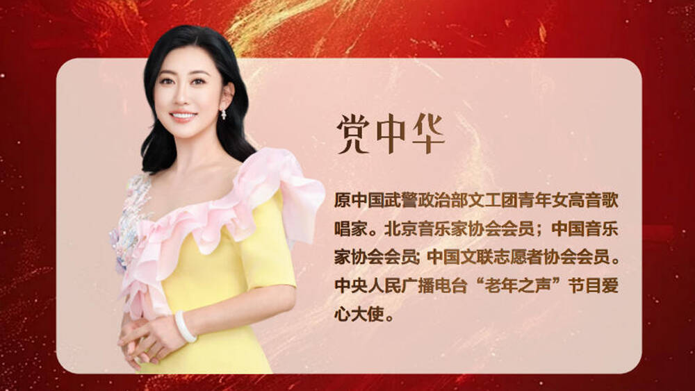 党中华,是原中国武警政治部文工团青年女高音歌唱家,北京音乐家协会会员、中国音乐家协会会员。舞台上的党中华,是实力与口碑兼具的实力派歌唱家。她曾多次受邀参加 CCTV《民歌中国》《天天把歌唱》《黄金 100 秒》等节目录制,歌声传遍千家万户。她是第三届亚洲青年歌唱家民族唱法获奖歌手,曾推出个人独唱专辑《江山盛装》,用歌声献礼伟大时代。她的原创代表作品有《桃李满园》《阅兵》《仰望五星红旗》等,具有强烈的艺术感染力和广泛的群众基础。