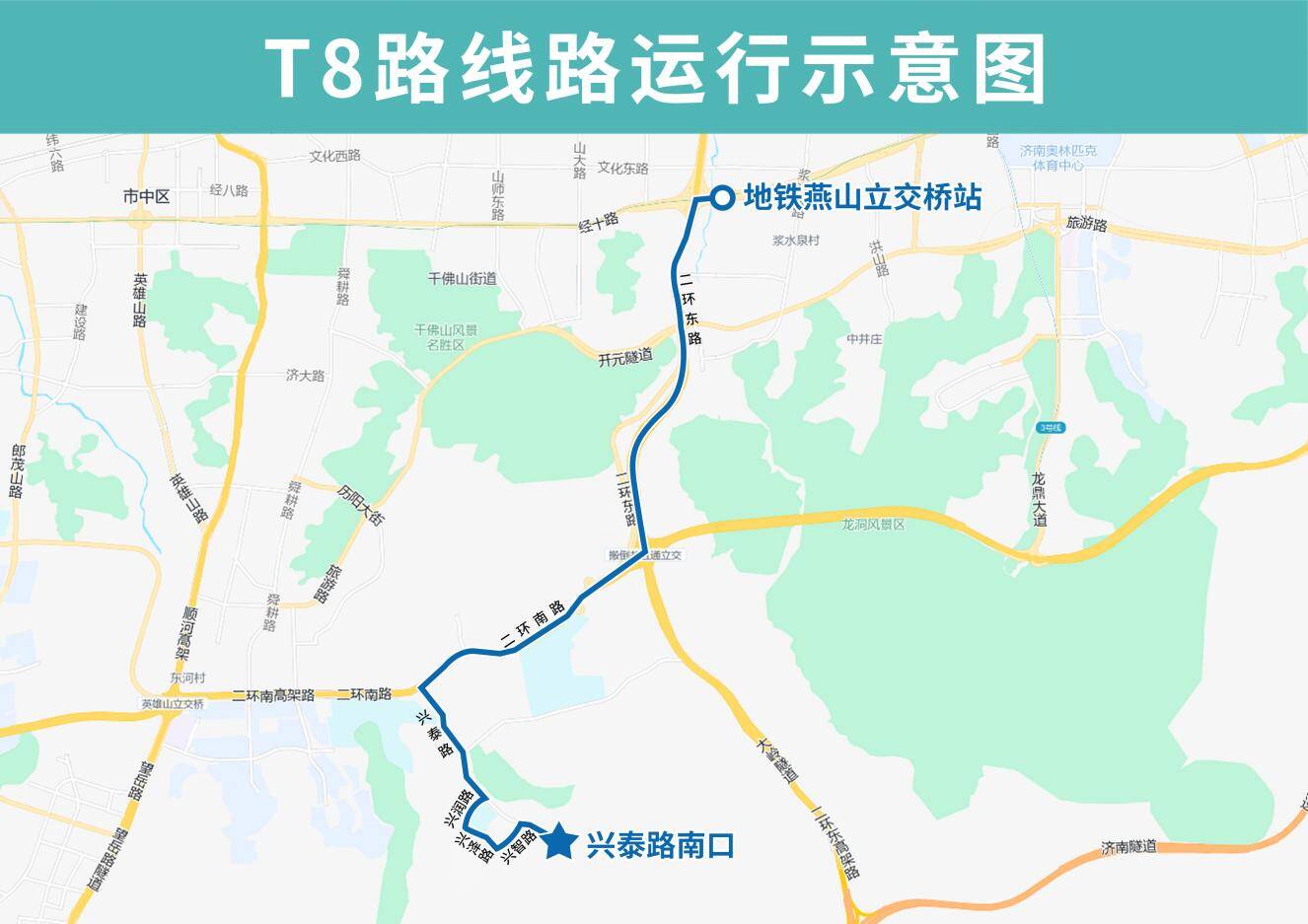 >>>持续推进公交与地铁接驳,4月22日起济南公交开通试运行T8路。T8路由兴泰路南口开往地铁燕山立交桥站,主要途经兴泰路、兴智路、兴泽路、兴润路、兴泰路、二环南路、老虎山隧道、二环东路、经十路,沿途设置兴泰路南口、兴智路兴泰路(路西)、兴泰路兴智路(路南)、泉泽小学、泉泽中学、兴泰路二环南路、兴隆山庄西、山财大燕山校区、地铁燕山立交桥站站点。