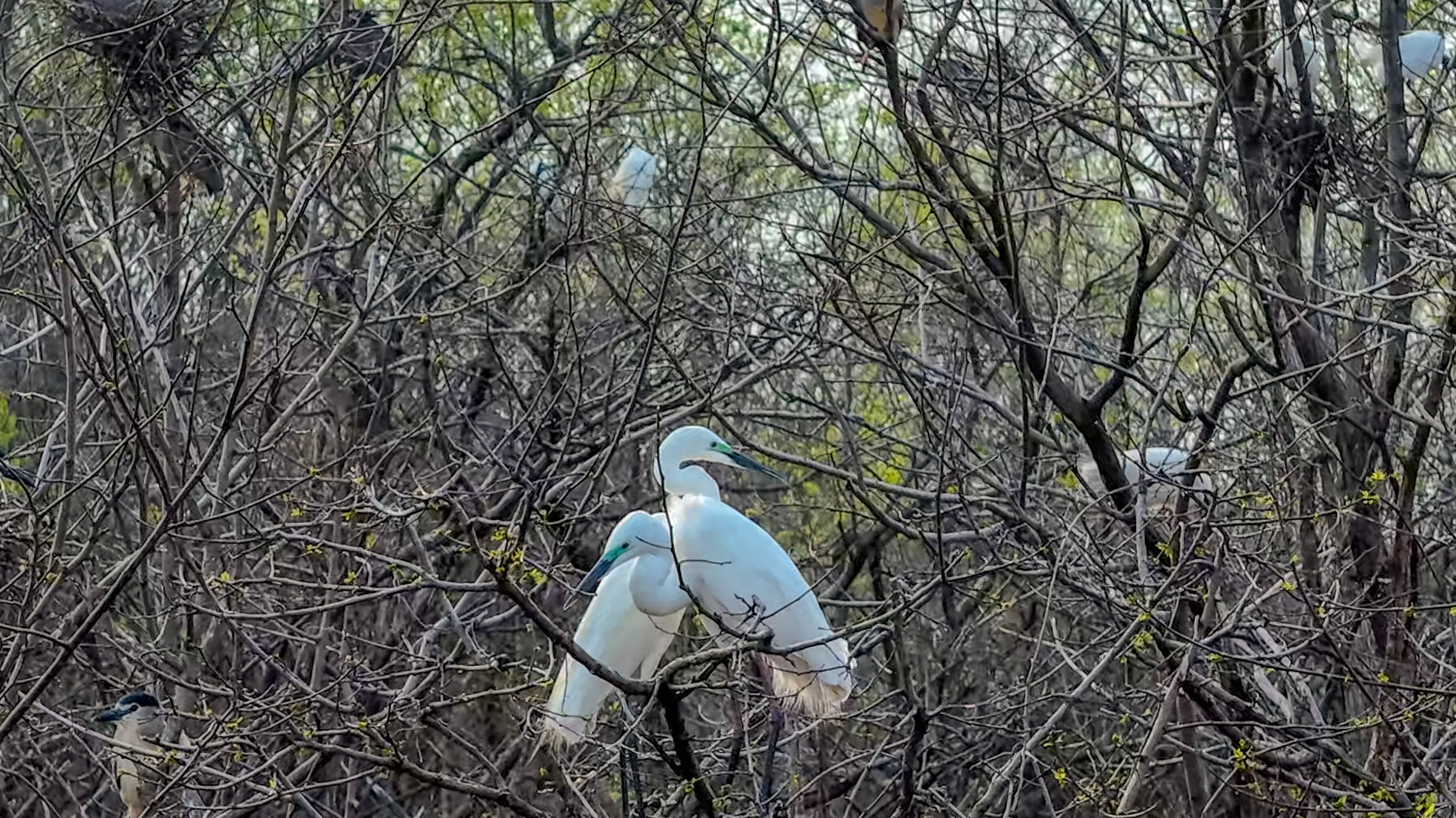 只见一只只白鹭栖息在树梢,或停留在岸边,时而在水面起舞,时而展翅冲向云霄。“磬动青林晚,人惊白鹭飞”,古人笔下的清雅意境在此照进现实。眼下,一群群密集如云的白鹭正浩浩荡荡地陆续从南方迁徙而来,与林子里的喜鹊、黄鹂、布谷鸟一起上演百鸟齐鸣的盛宴。