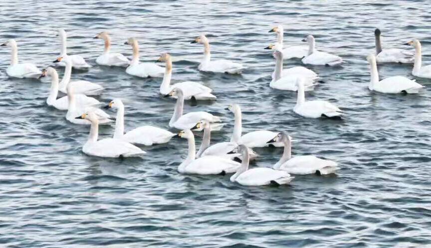 挪开眼前的美妙景象,上千只候鸟邂逅九龙湖的情景犹在眼前。天鹅、鸬鹚、大雁同框出现,翻飞翔集、觅食嬉戏,用演绎芭蕾的优雅舞姿给了这片碧波最生动的褒奖。
