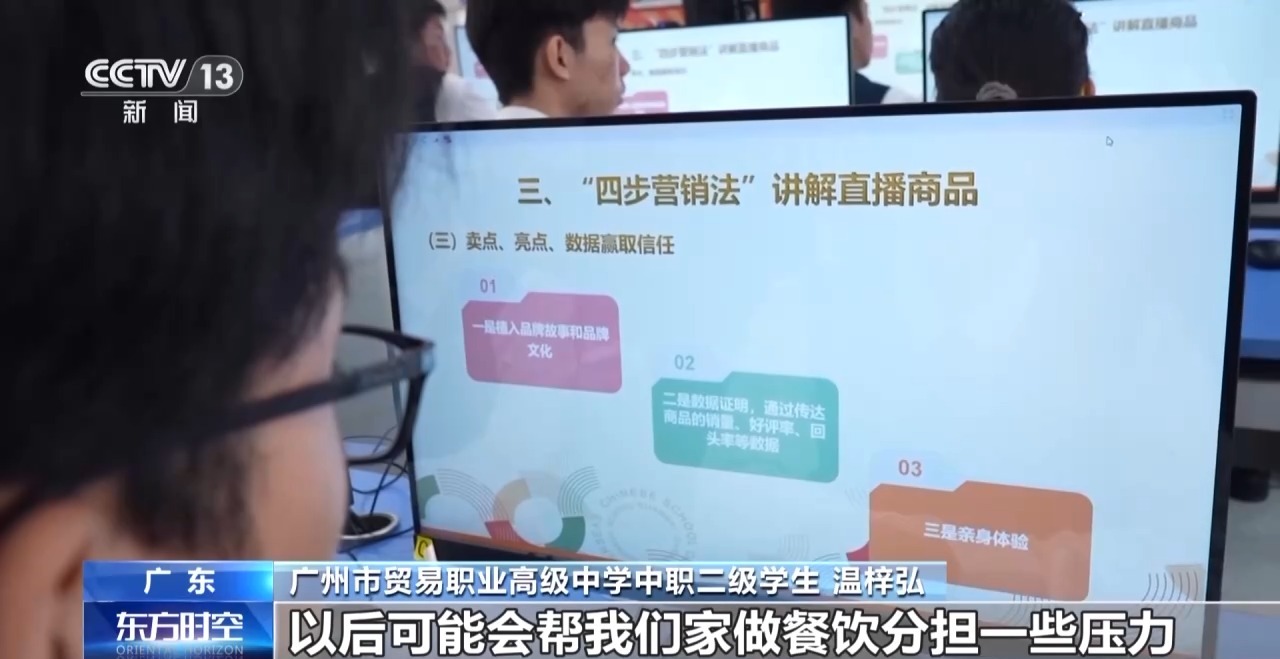 广州市贸易职业高级中学中职二级学生 温梓弘:我在高一就选了短视频剪辑和创作,我对这个特别感兴趣,感觉如果这个做好了以后可以帮我们家做餐饮分担一些压力。然后向学校申请了转学籍的名额,成功转到了中职这边。