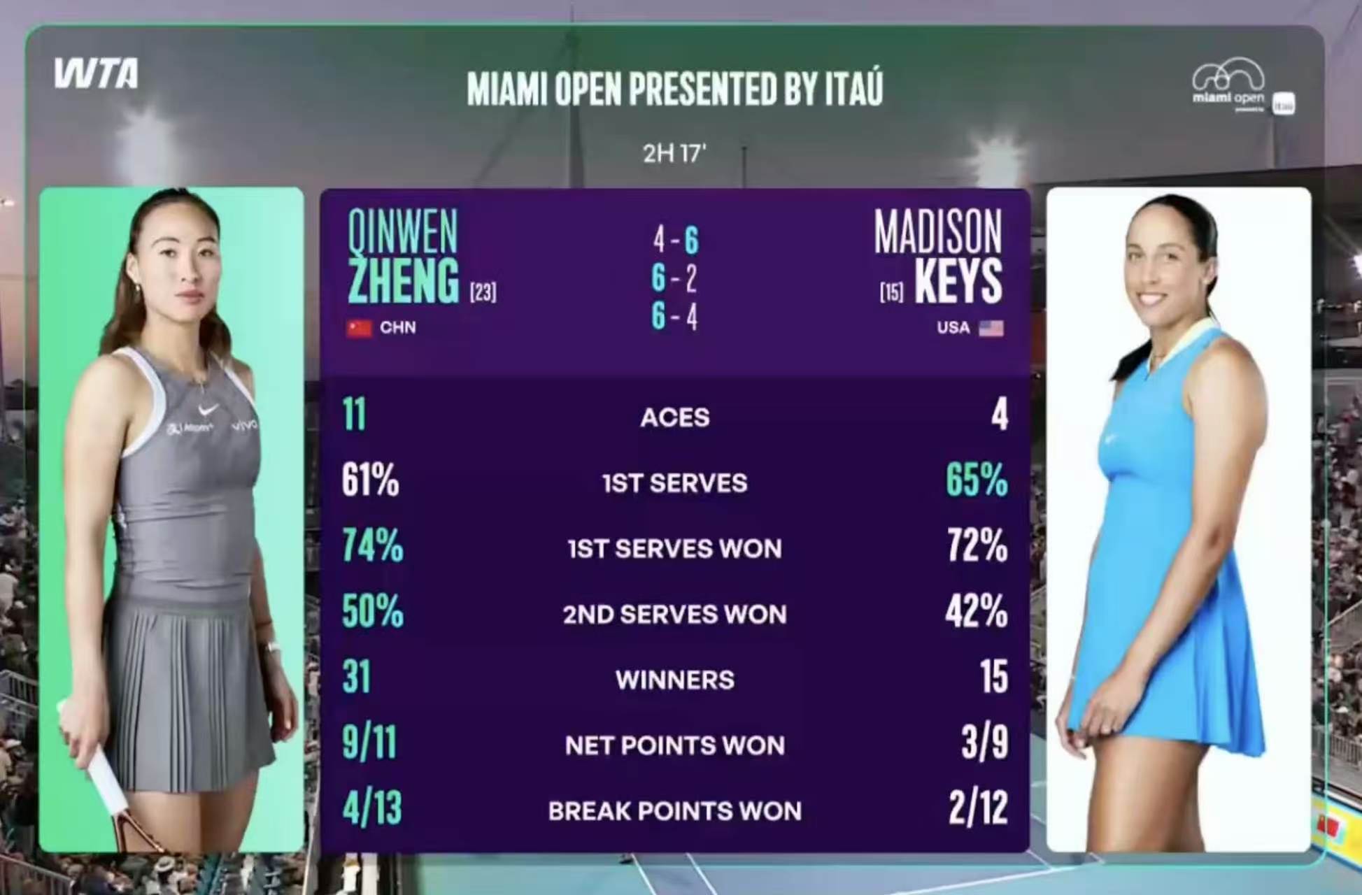 当地时间3月22日,在WTA1000迈阿密站女单第三轮比赛中,中国选手郑钦文以4-6、6-2、6-4战胜前澳网冠军凯斯,在本站连续战胜两位大满贯冠军,职业生涯第三次闯入赛会16强。全场比赛郑钦文轰出31记制胜分,发出11记Ace球,挽救了10个破发点。下一轮,郑钦文将迎战萨巴伦卡和麦克纳莉之间的胜者。