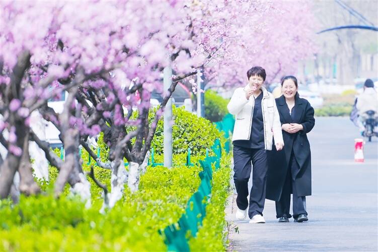 春风拂面,满城生机。齐盛湖公园内,垂柳拂过澄澈湖水,亭台与高楼相映成趣,园中小径上,行人缓步慢行,在暖阳里感受春的温度;张店区重庆路两侧,美人梅次第绽放,粉红花枝沿路舒展,有人驻足留影,有人结伴漫步……整座城市慢慢舒展,处处透露着向上的生机。