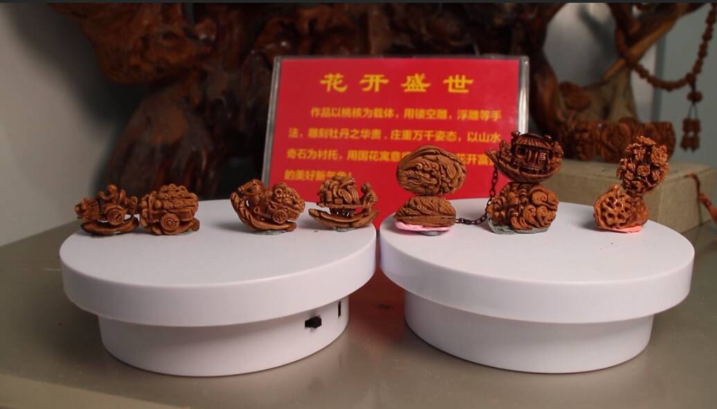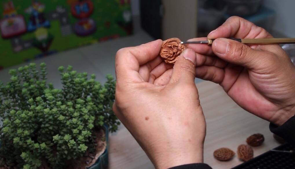 在手艺人李奎的工作台上,数十把刻刀整齐排列,他正以生肖龙为灵感,在桃核上雕琢立体造型,龙的肌肉纹理、姿态神韵清晰可见。李奎介绍,桃核的传统题材如《核舟记》《十八罗汉》是根基,如今当地手艺人融入恐龙、超然台等诸城元素,将核雕与地域文化实现同频共振,让老手艺讲出新故事。桃雕的核心魅力,在于因材施艺、随形赋神。每一枚桃核的纹理、质地、凹槽都独一无二,艺人无法照搬图纸,必须顺着天然纹路顺势创作,正所谓 “三分雕刻,七分天成”。核雕之难,难在以小见大、毫厘较真。硬币大小的桃核上,要雕出亭台楼阁、人物车马,且须眉毕现、气韵生动,考验的是数十年如一日的功底。