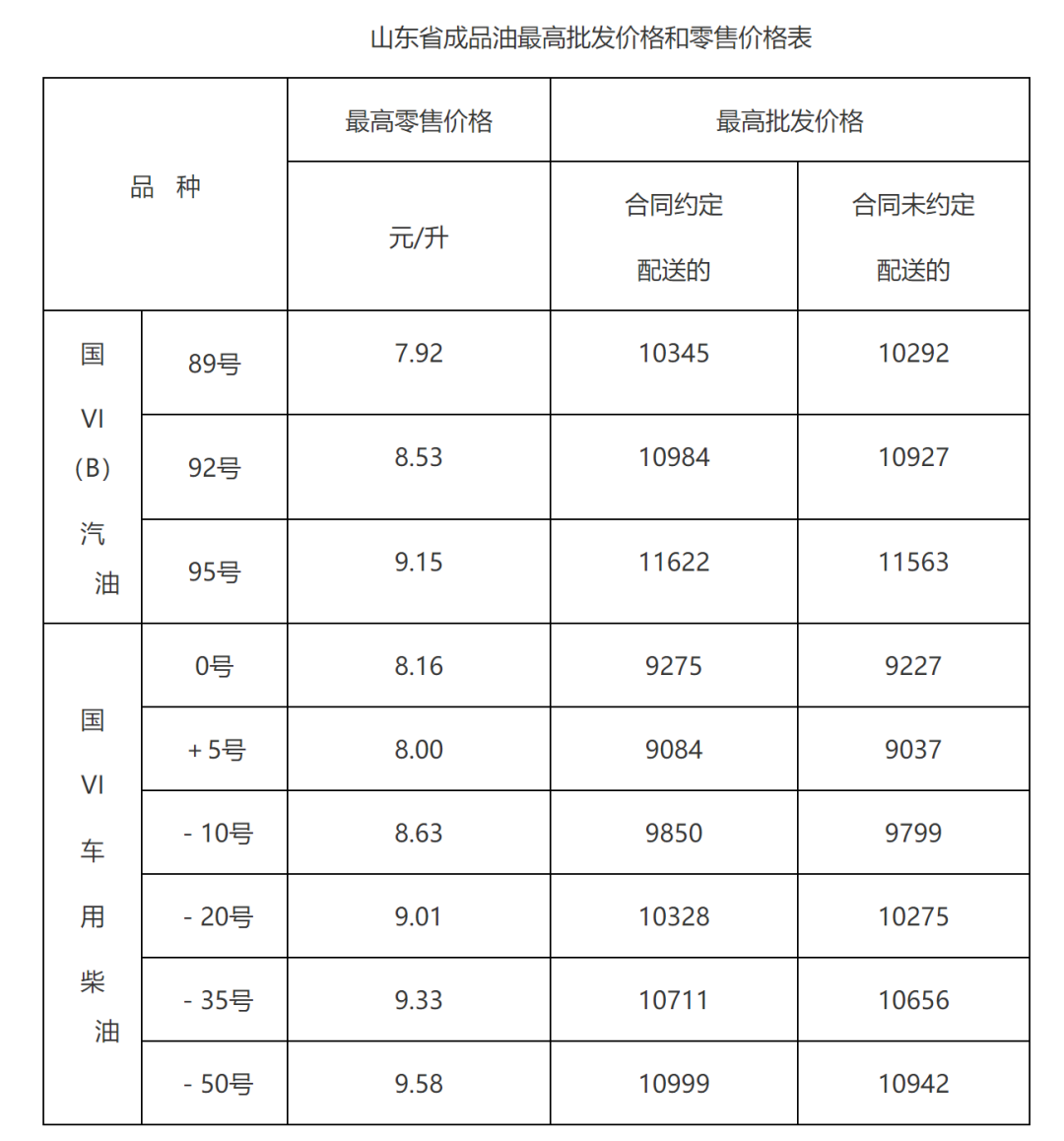 随后,山东省发展和改革委发布《我省成品油价格调整(2026年3月23日)》,根据国家发展改革委发布的调价信息,自2026年3月23日24时起,我省汽油、柴油最高批发、零售价格每吨分别上涨1160元和1115元。调整后我省各标号汽、柴油最高批发和最高零售价格及有关事项见附表。