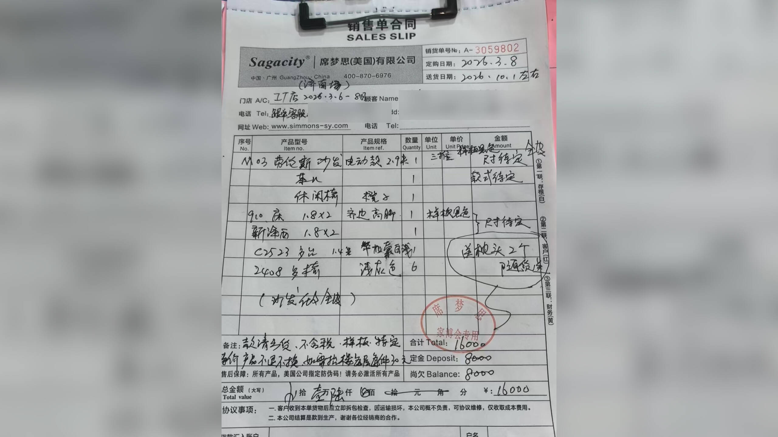 卢女士说,她在展会内的“席梦思”品牌展位,订购了沙发、床垫、床及餐桌,合计一万六千元,并当场交了八千元定金。付款回家后,她查看订单,突然发现疑点,该品牌为Sagacity席梦思(美国),与她了解到的Simmons席梦思存在不同。更蹊跷的是,合同上印制的网址竟还带有“simmons”标识。面对质疑,商家告知她代理的是美国品牌的席梦思,还声称拥有官方授权。但卢女士认为,商家行为明显涉嫌误导消费者,属于消费欺诈。