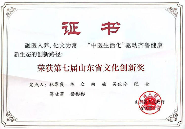 近年来,学校坚守“以文化人、以医惠民”理念,持续推进“中医生活化”落地见效,在中医药文化传承创新、社科研究与社会服务等方面不断取得新突破。下一步,学校将以此次获奖为新起点,进一步深化中医药文化创造性转化、创新性发展实践,聚焦成果转化与惠民导向,推动更多优质成果从“实验室”走向“生活场”,从“学术研究”迈向“民生应用”,为健康山东建设和文化强省战略贡献更大中医药智慧与力量。