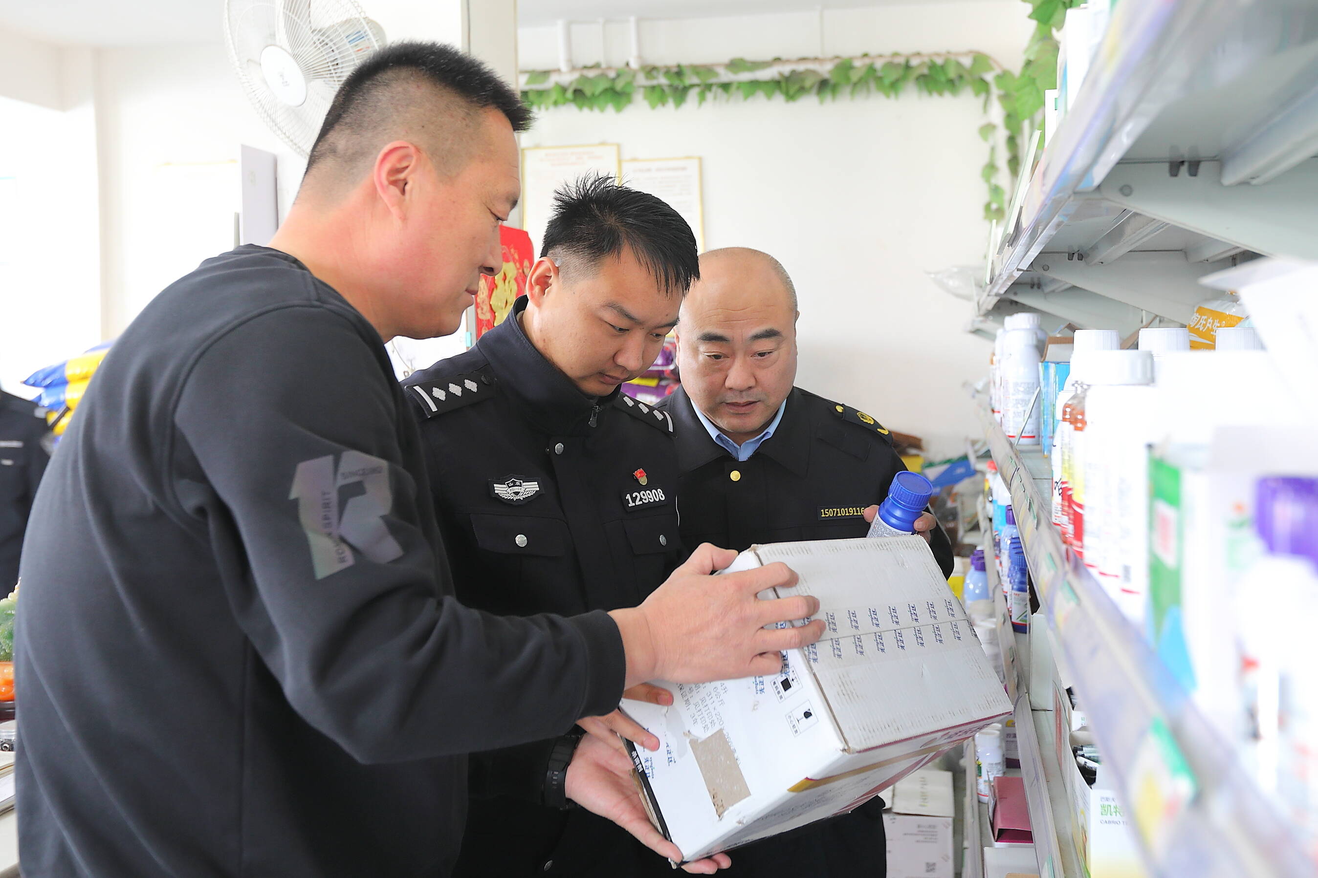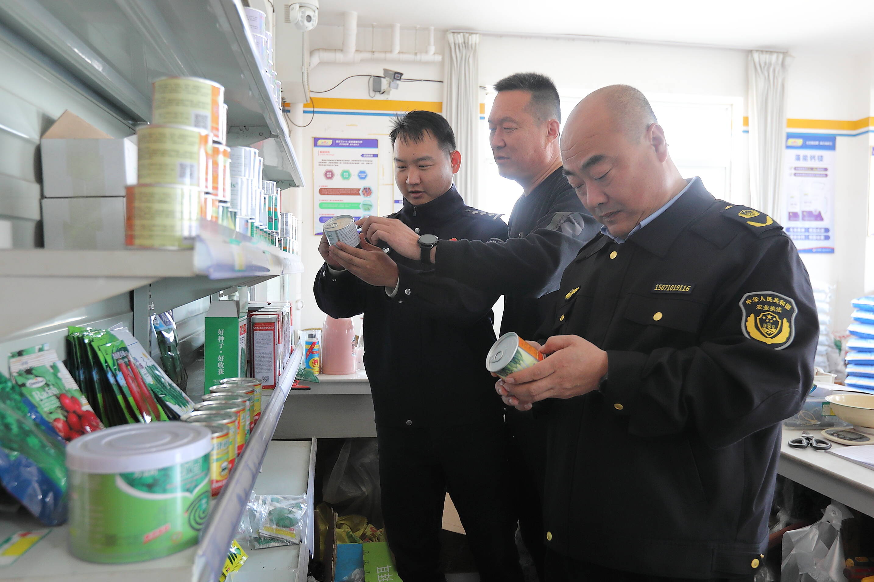 图为3月24日,安丘市公安局环境资源与食品药品犯罪侦查大队民警与农业农村部门执法人员检查种子门市。