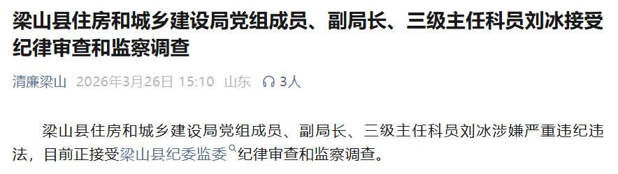 齐鲁网·闪电新闻3月26日讯 梁山县住房和城乡建设局党组成员、副局长、三级主任科员刘冰涉嫌严重违纪违法,目前正接受梁山县纪委监委纪律审查和监察调查。