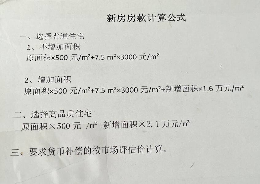 舜耕路38号院原址改造项目筹建处的桌面上贴着的《新房房款计算公式》显示,选择普通住宅不增加面积,以原面积×500元/平方米+7.5平方米(每户电梯面积补偿面积,记者注)×3000元/平方米计算;增加面积则是原面积×500元/平方米+7.5平方米×3000元/平方米+新增面积X1.6万元/平方米。其中7.5平方米是选择15层的两梯两户普通住宅的业主,因两户平摊一部电梯面积,每户多增加约7.5平方米,增加部分按3000元/平方米计算。