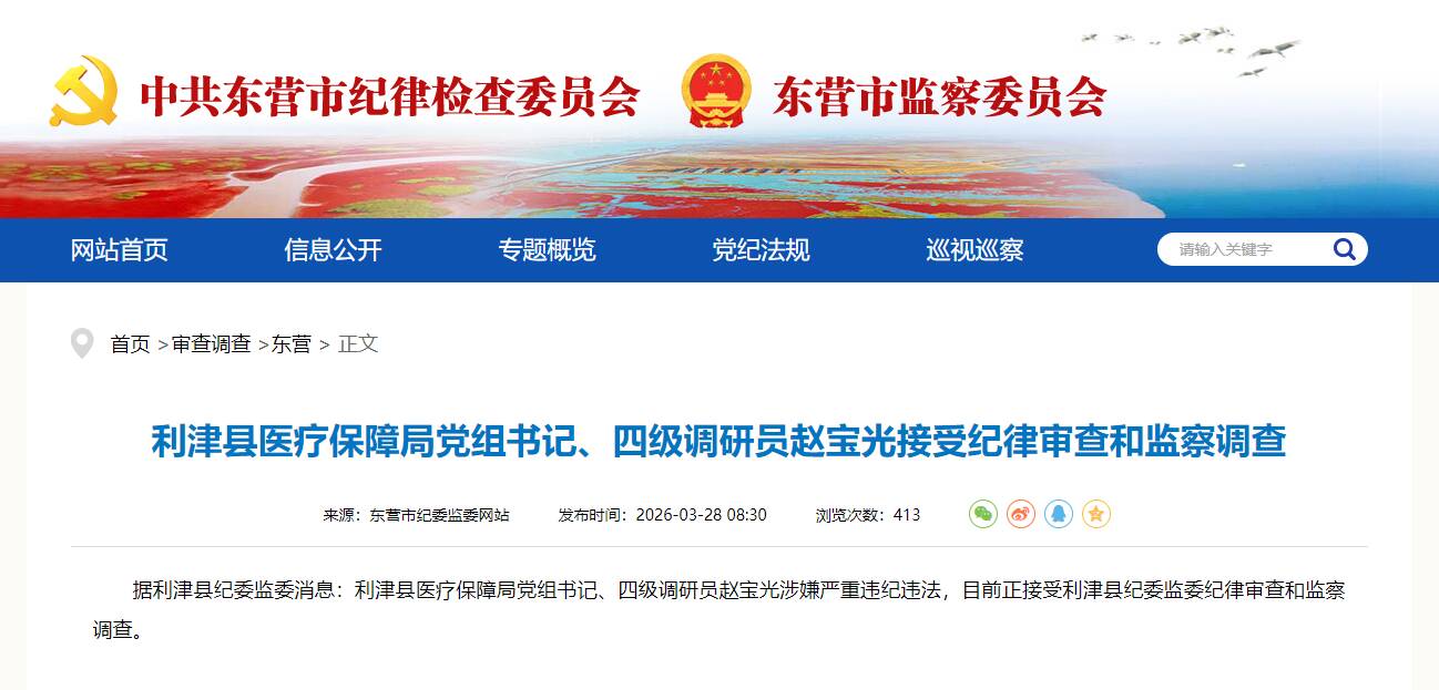 齐鲁网·闪电新闻3月28日讯 据利津县纪委监委消息:利津县医疗保障局党组书记、四级调研员赵宝光涉嫌严重违纪违法,目前正接受利津县纪委监委纪律审查和监察调查。
