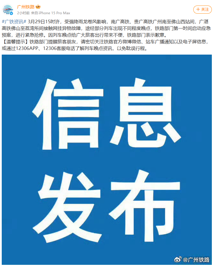 3月29日15时许,受强降雨龙卷风影响,南广高铁、贵广高铁广州南至佛山西站间,广湛高铁佛山至荔湾所间接触网挂异物故障,途经部分列车出现不同程度晚点,铁路部门第一时间启动应急预案,进行紧急抢修。因列车晚点给广大旅客出行带来不便,铁路部门表示歉意。