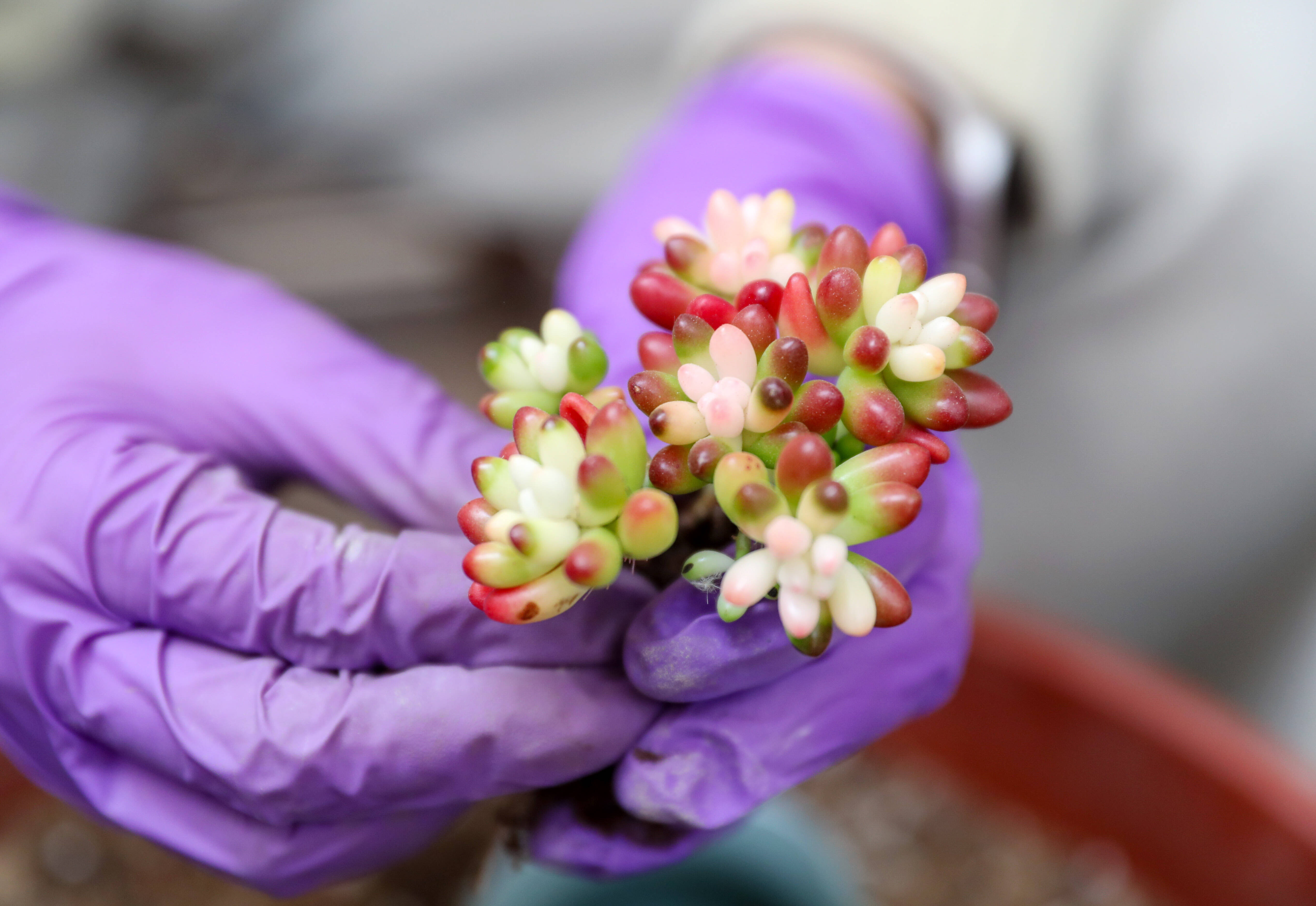 图为商家在移栽多肉植物