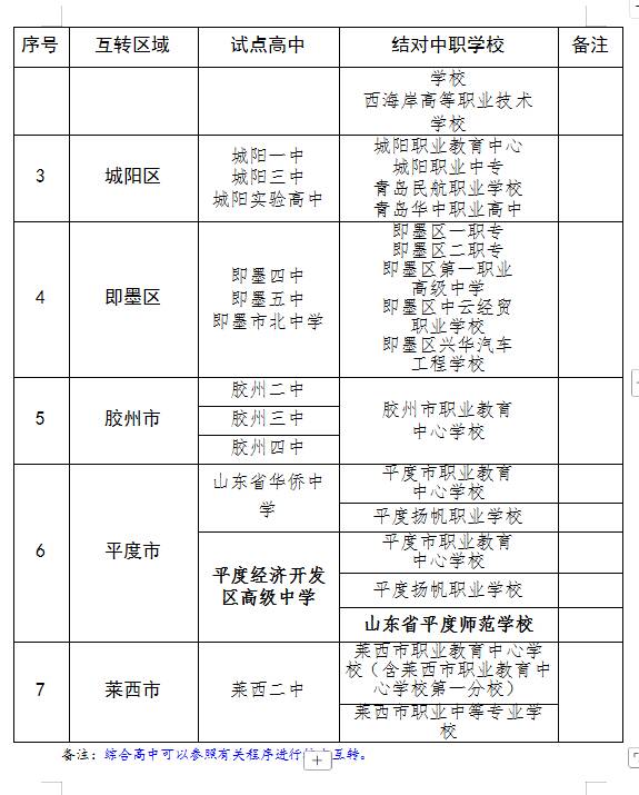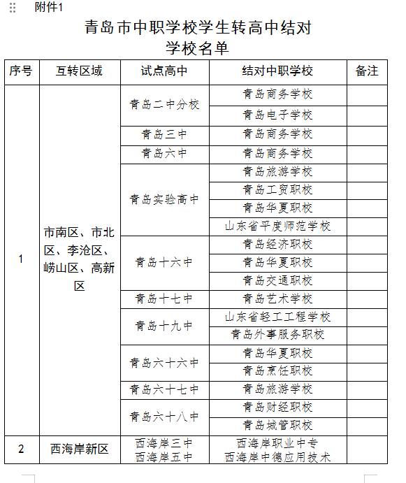 互转根据青岛市高中招生范围划分为7个区域,其中市南区、市北区、李沧区、崂山区、高新区作为一个区域,由青岛市教育局负责组织;西海岸新区、城阳区、即墨区、胶州市、平度市、莱西市6个区(市)各自为1个区域,由各区(市)教育行政部门负责组织。互转原则上在各自区域内进行。各区域结合实际,确定一定数量的高中和中职作为互转学校,可实行“一对一”“一对多”“多对多”结对,互转学校确定后原则上三年内保持不变,三年后可动态调整。