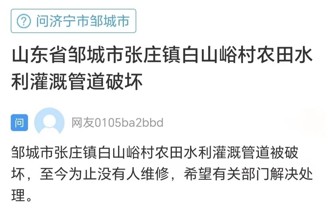 齐鲁网·闪电新闻4月1日讯 济宁的一位网友在闪电新闻网络问政平台留言说:邹城市张庄镇白山峪村农田水利灌溉管道被破坏,至今为止没有人维修,希望有关部门解决处理。
